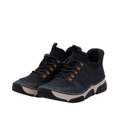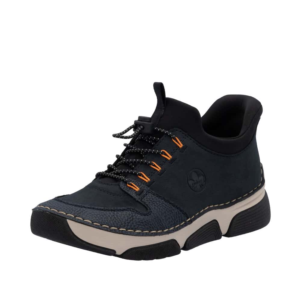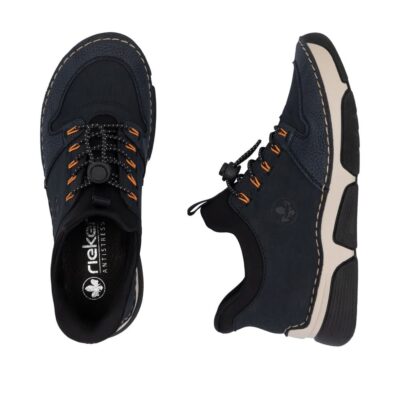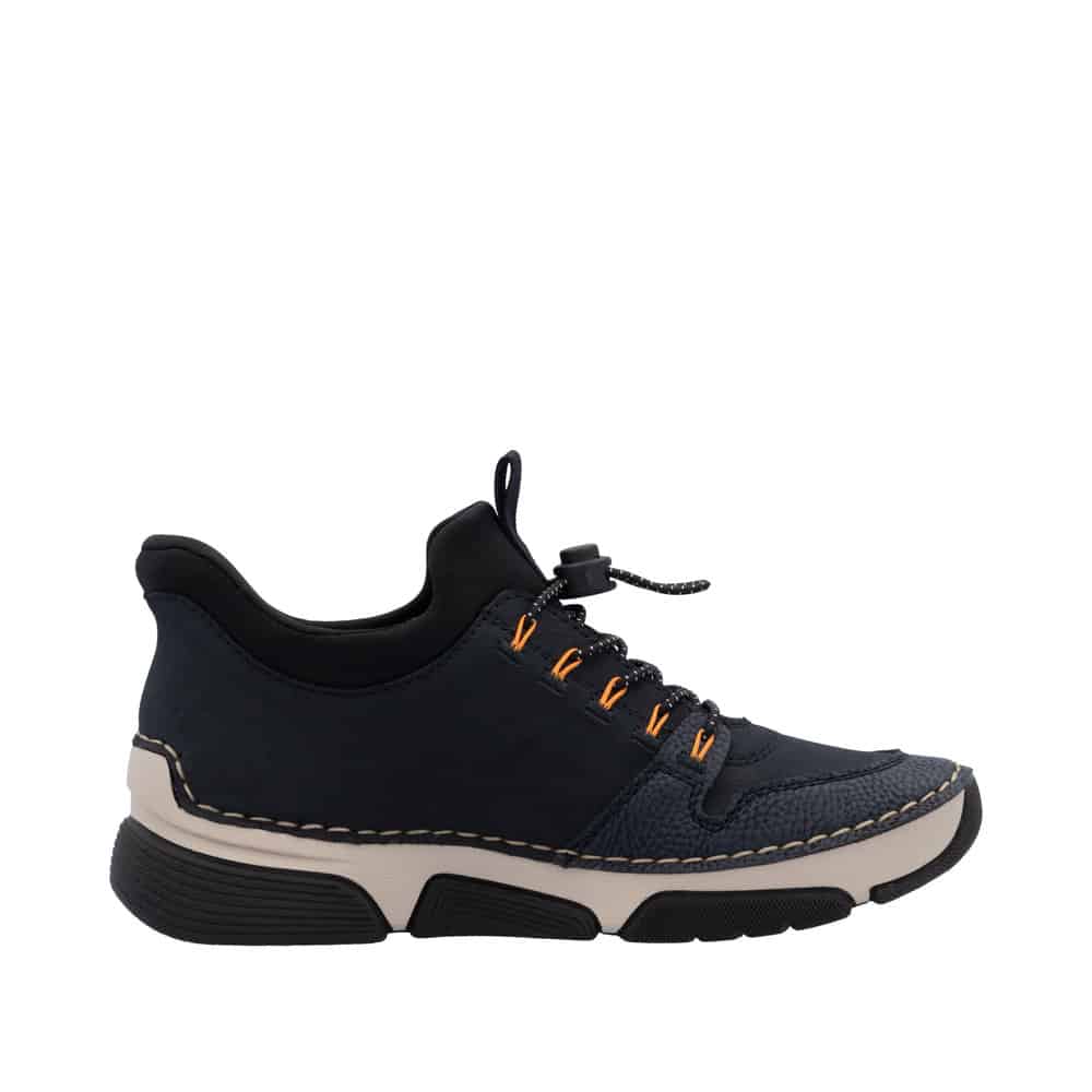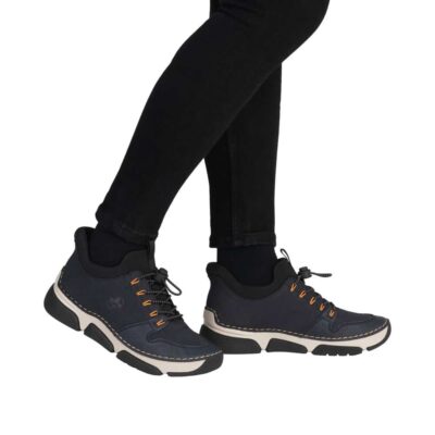 Rieker Ready 2 Go sneakers til dame i blå. Med Ready 2 Go og en fast hælkappe er disse sneakers nemme at tage på uden brug af hænder. Den justerbare elastik foran giver en god og fleksibel pasform. Indvendigt sørger en udtagelig blød skindsål for god komfort gennem hele dagen, mens Rieker Antistress-teknologien sikrer øget stødabsorbering og smidig bevægelse.