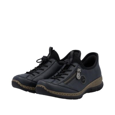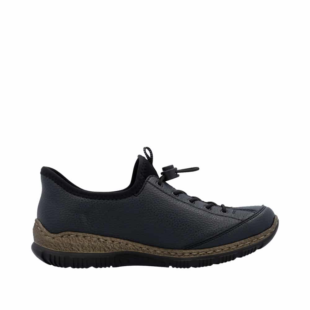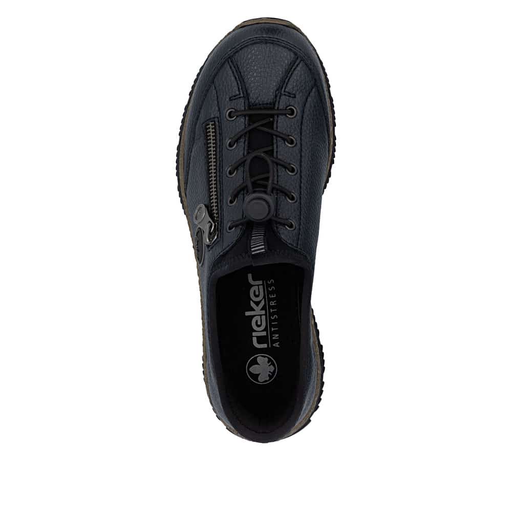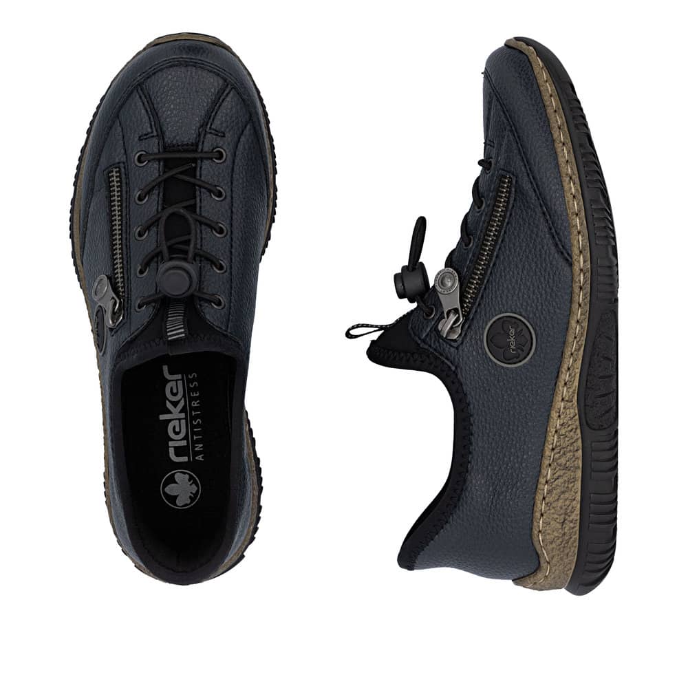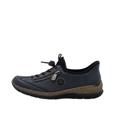Rieker Ready 2 Go sneakers til dame i mørkeblå. Smart og praktisk sneakers i mørkeblå med fokus på nemt brug og høj komfort. Takket være Hands Free Ready 2 Go teknologien og en fast hælkappe kan du let træde i skoen uden at bruge hænder. Den elastiske åbning og den justerbare elastik foran sikrer en fleksibel pasform. Indvendigt er skoen udstyret med en memosoft indersål, der giver blød støtte hele dagen. Ydersålen med Rieker Antistress er stødabsorberende og har et godt mønster, som giver dig ekstra støtte og skridsikkerhed.