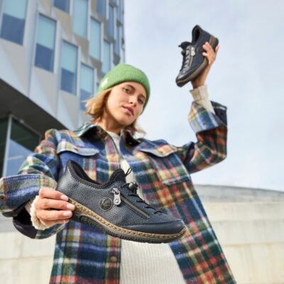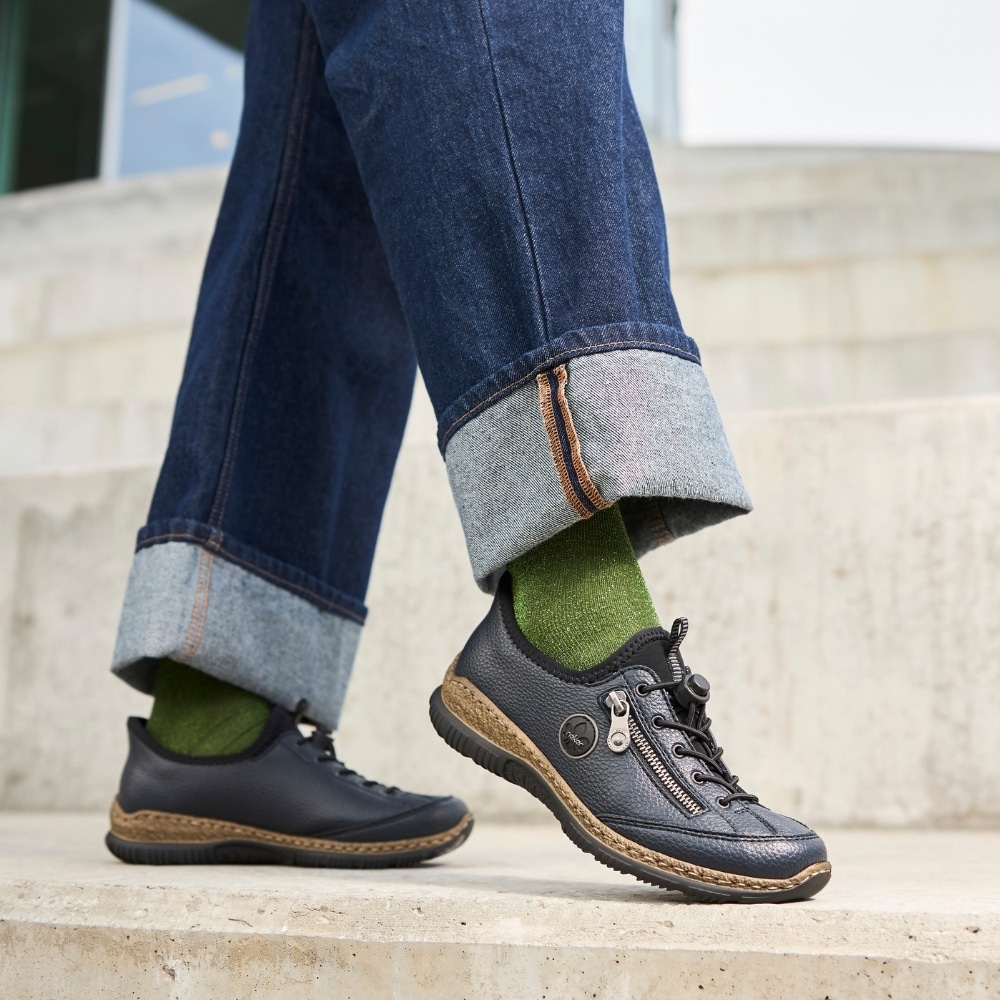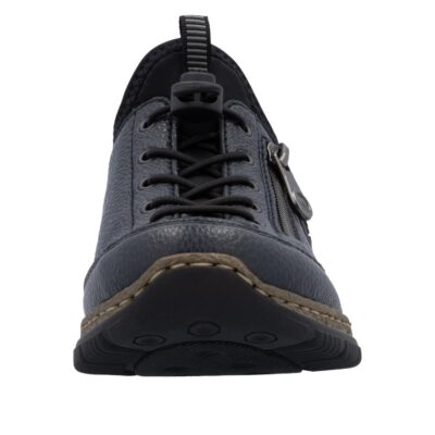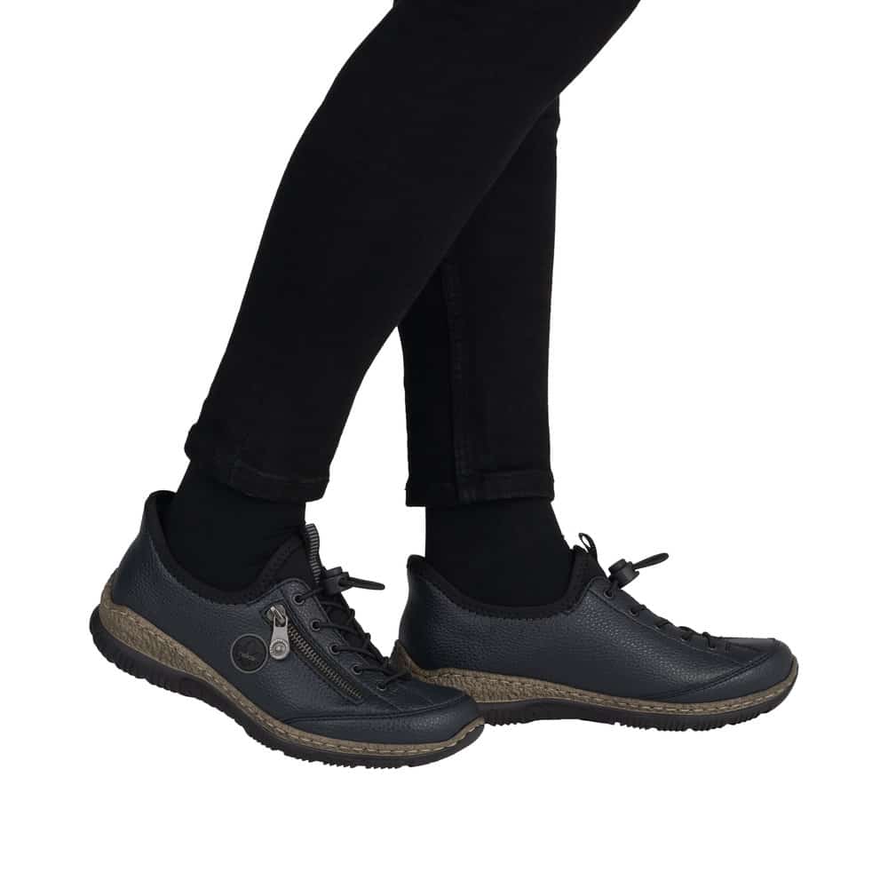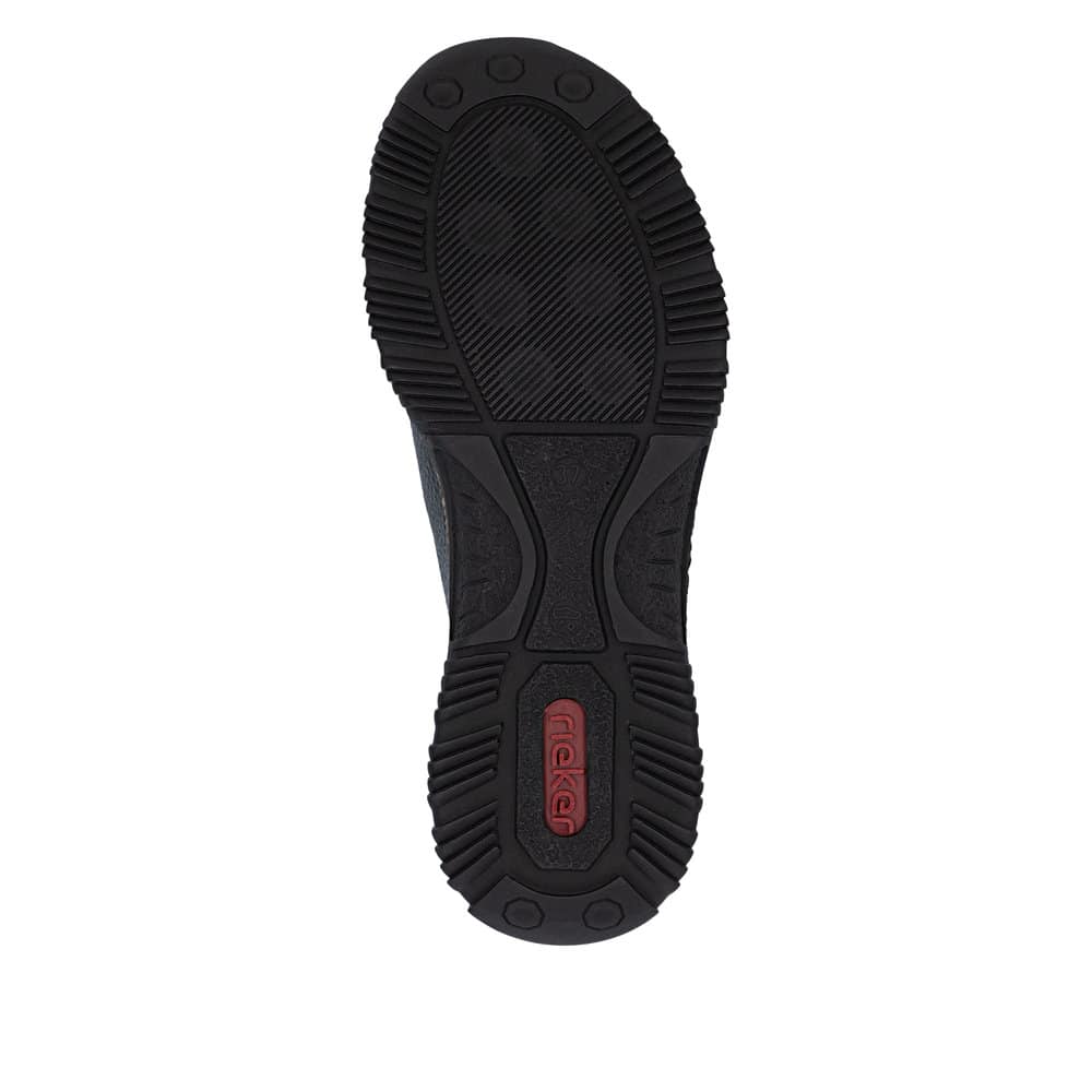 Rieker Ready 2 Go sneakers til dame i mørkeblå. Smart og praktisk sneakers i mørkeblå med fokus på nemt brug og høj komfort. Takket være Hands Free Ready 2 Go teknologien og en fast hælkappe kan du let træde i skoen uden at bruge hænder. Den elastiske åbning og den justerbare elastik foran sikrer en fleksibel pasform. Indvendigt er skoen udstyret med en memosoft indersål, der giver blød støtte hele dagen. Ydersålen med Rieker Antistress er stødabsorberende og har et godt mønster, som giver dig ekstra støtte og skridsikkerhed.