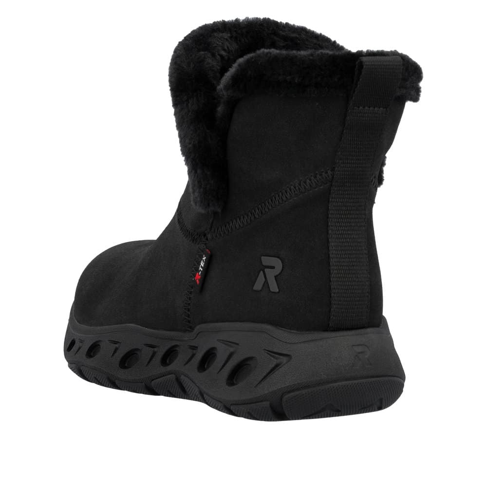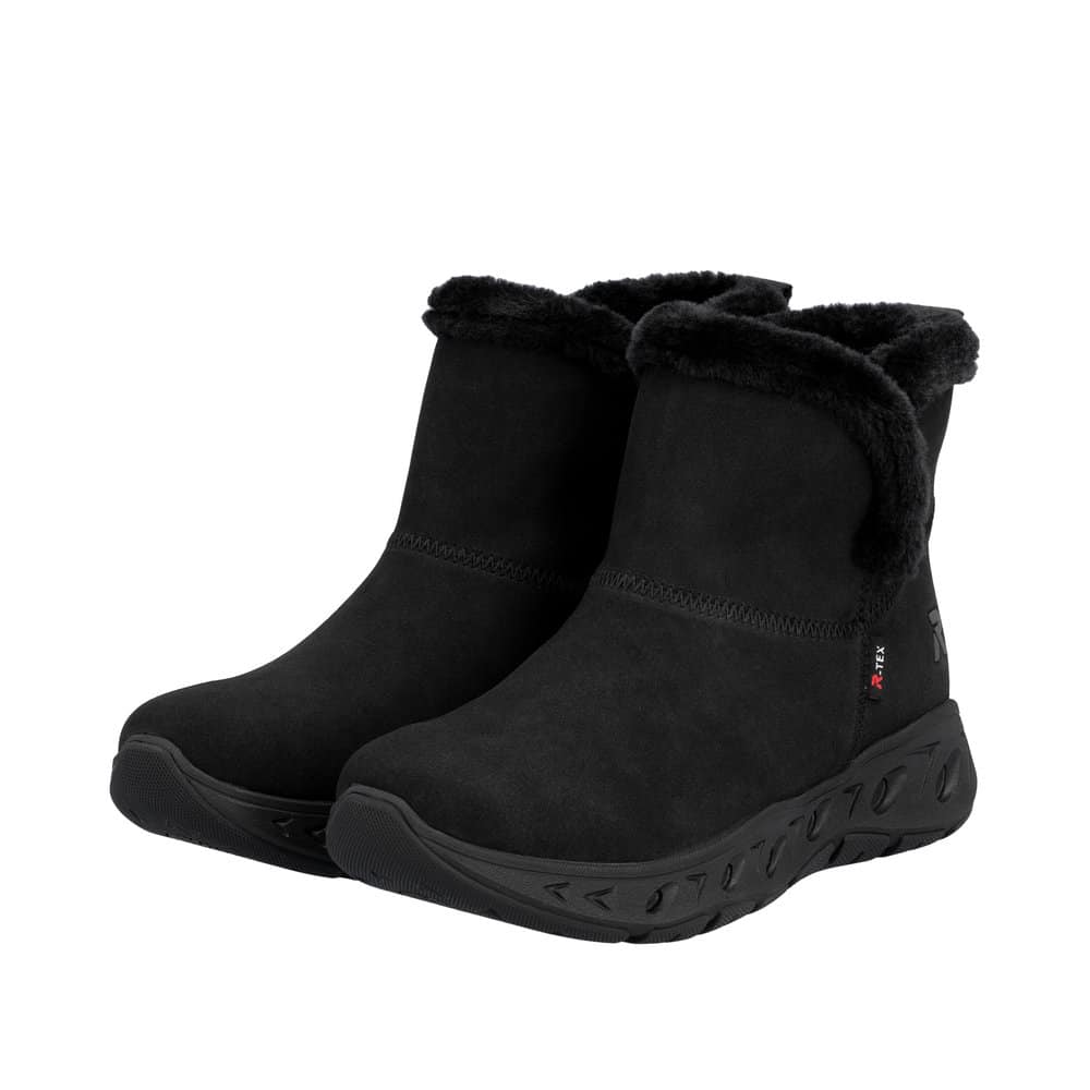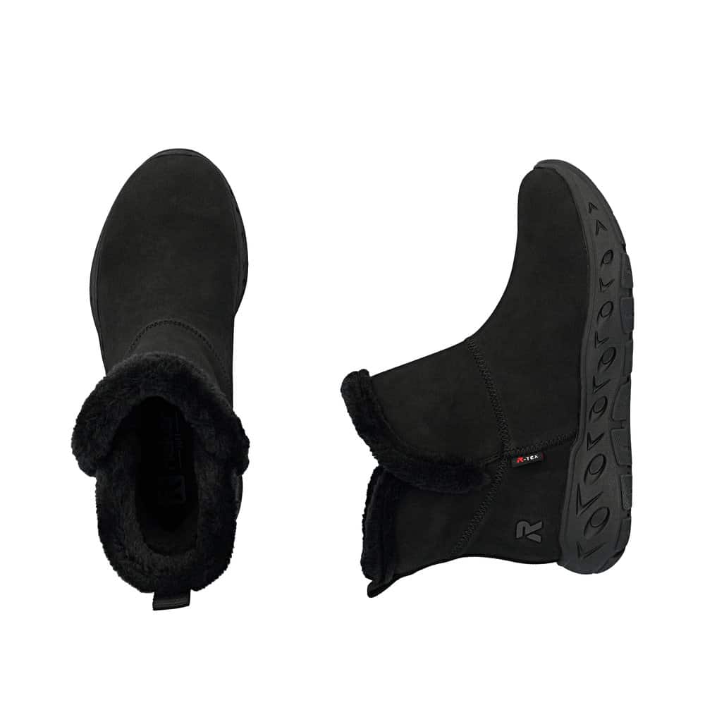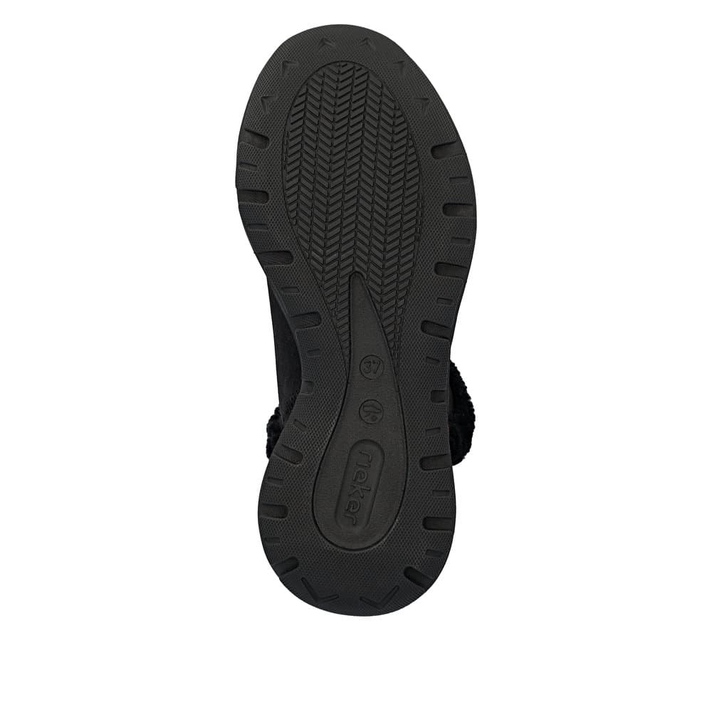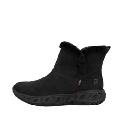 Rieker Ready 2 Go støvle til dame i sort. Elegant og praktisk på samme tid, denne sorte støvle er perfekt til hverdagen. Takket være Ready 2 Go og den faste hælkappe, kan du nemt komme i støvlen uden brug af hænder. Indvendigt mødes du af en varm foring og en Memosoft sål, der giver en behagelig komfort. Rieker-Tex teknologien gør støvlen kraftig vandafvisende, og den mønstrede giver øget stødabsorbering og skridsikkerhed.