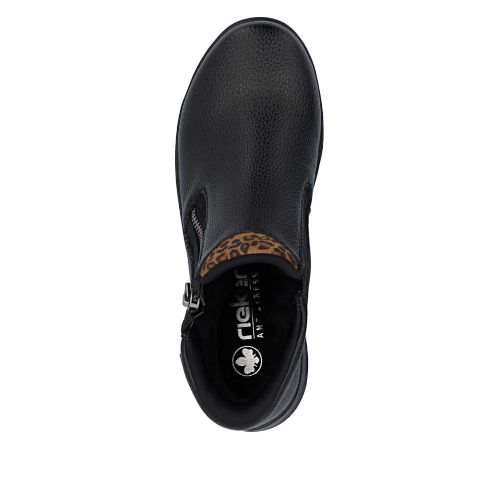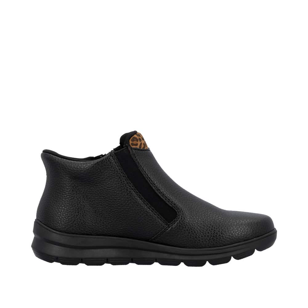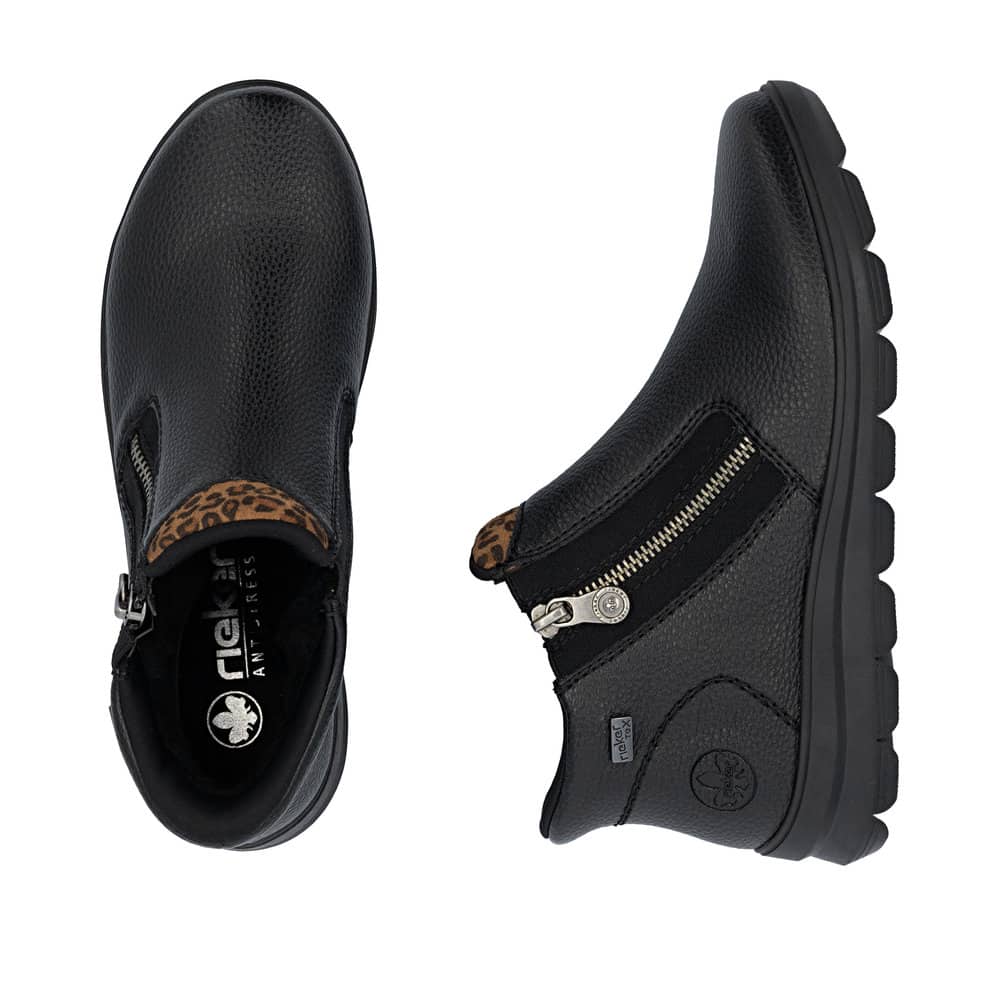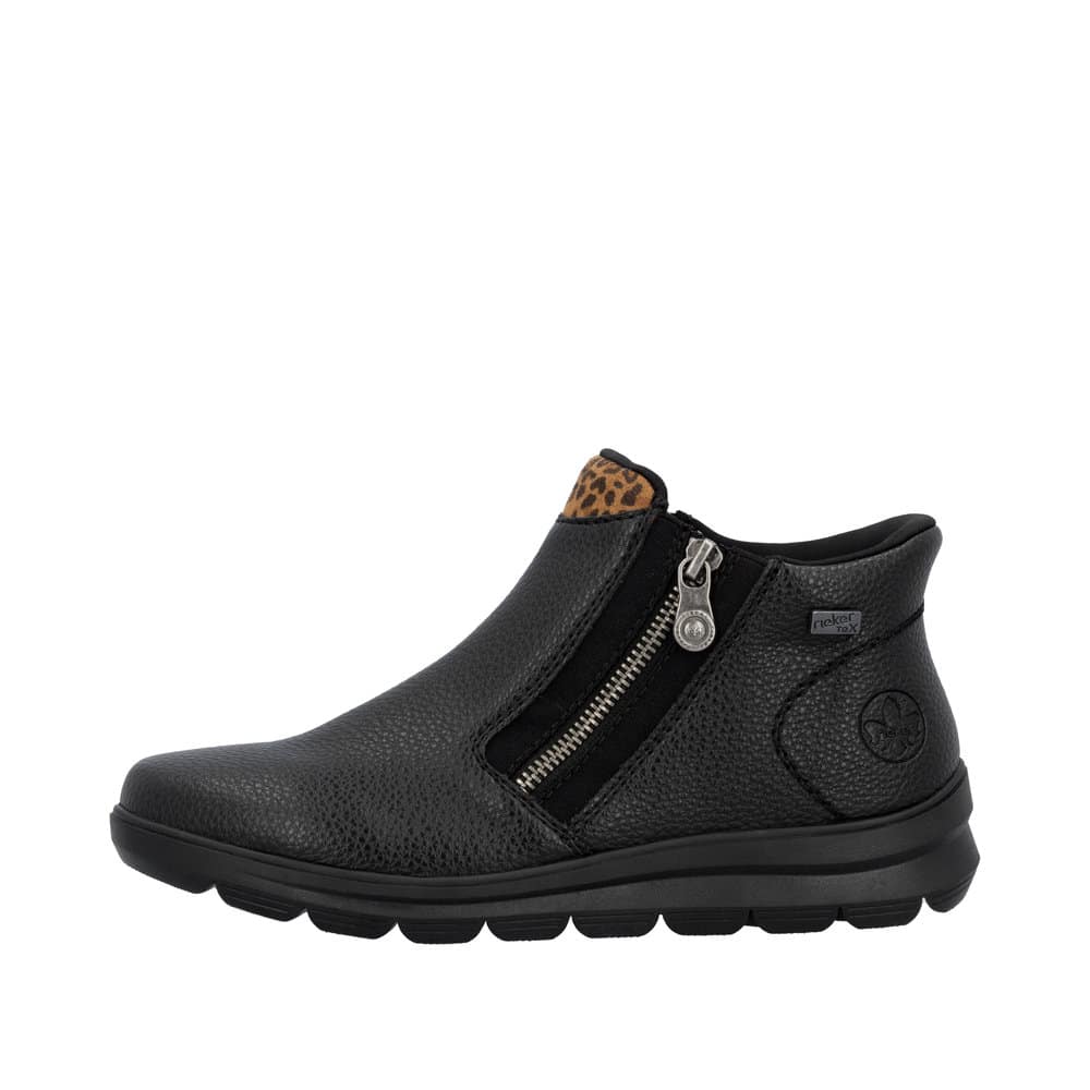 Rieker Ready 2 Go støvle til dame i sort. Klassisk sort støvle med fokus på både komfort og funktion. Med Ready 2 Go teknologi og fast hælkappe kan du tage støvlen på uden brug af hænder. Støvlen har Rieker-Tex, som gør støvlen kraftigt vandafvisende. Indvendigt er der en blød udtagelig sål og en varm foring, der holder fødderne behagelige hele dagen. Den mønstrede ydersål giver øget stødabsorbering og skridsikkerhed.