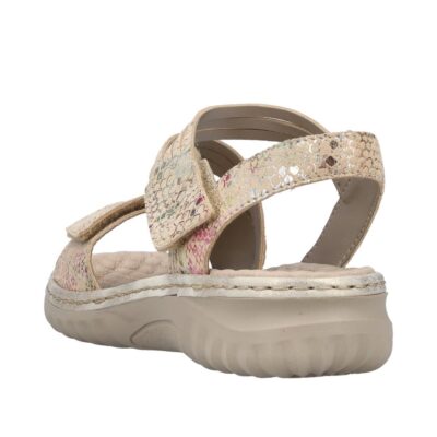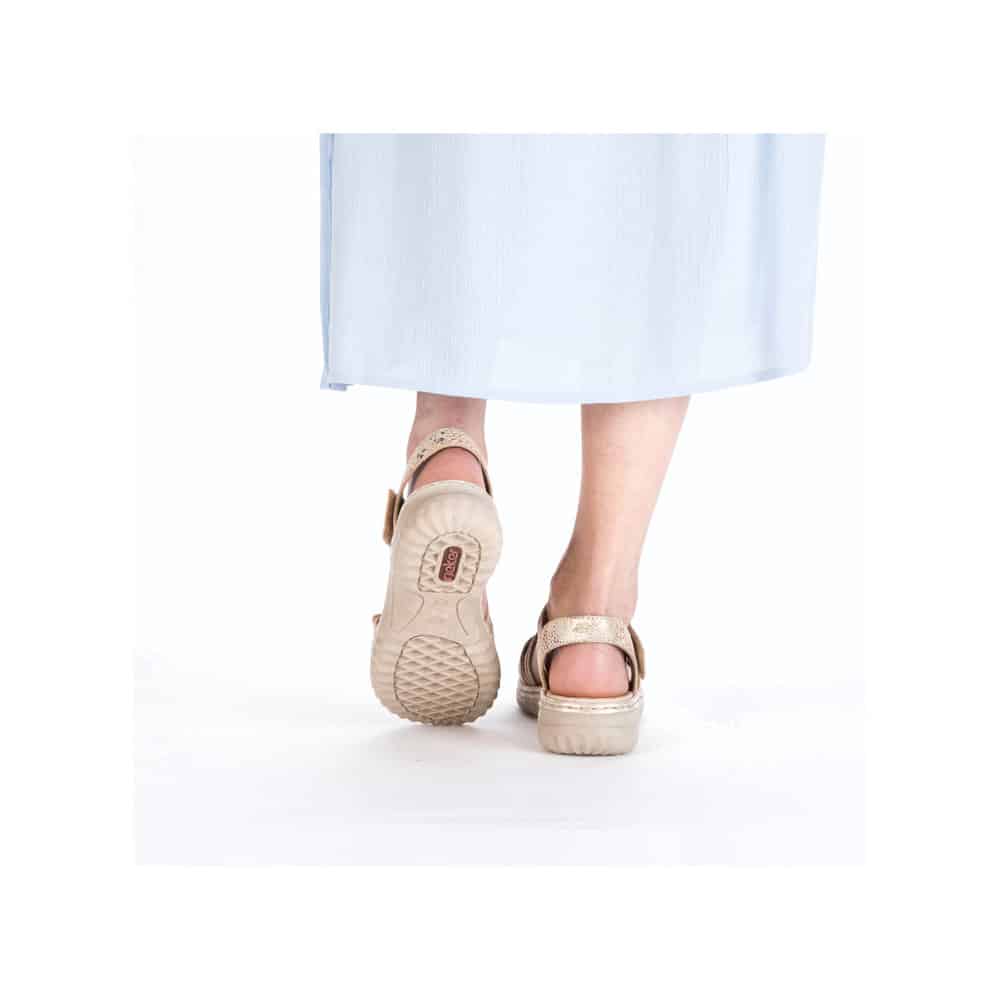 Rieker sandal til dame i beige. Denne elegante sandal har en skindoverdel med smuk farvekombination. Sandalen sikrer funktionalitet samt et stilfuldt look. Den noprede stødabsorberende ydersål er designet med en 4 cm høj kilehæl og et skridsikkert mønster, der sikrer stabilitet. Sandalens velcrorem i skind gør den let at tilpasse foden, så du får optimal komfort.
