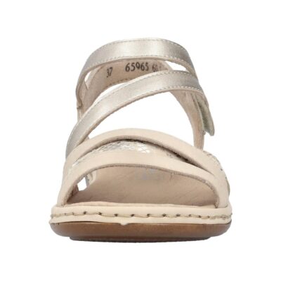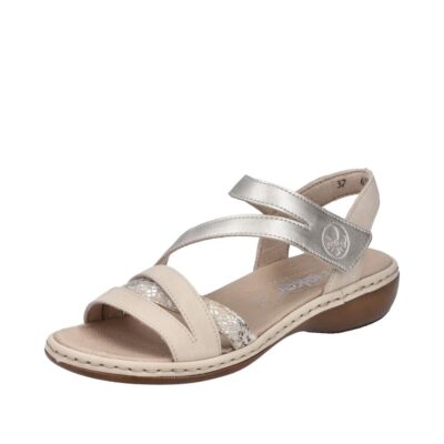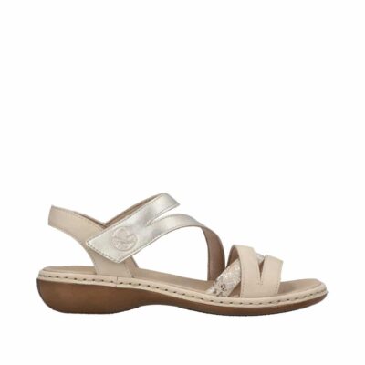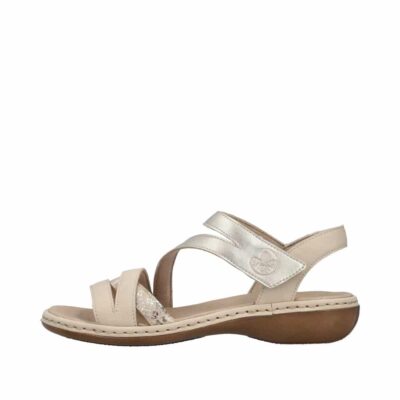 Rieker sandal til dame i beige. Med denne Rieker-sandal får du en let og fleksibel sandal, der er ideel til varme dage. Den har en elegant beige farve og et feminint look med fine detaljer i skind. Velcrolukningen giver en justerbar pasform, og den stødabsorberende sål sikrer optimal komfort hele dagen. Hælremmen sørger for ekstra stabilitet, så du kan bevæge dig ubesværet rundt.