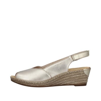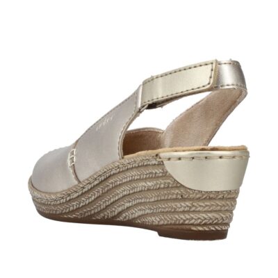Rieker sandal til dame i beige/guld. Lad dine fødder nyde komfort og stil med denne smukke Rieker-sandal i beige og guld. Sandalens kilehæl giver et flot løft, mens den fleksible sål med stødabsorberende egenskaber sikrer en behagelig gang. Velcrolukningen gør den nem at tage af og på, og det klassiske design gør den til et alsidigt valg til enhver lejlighed.