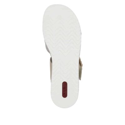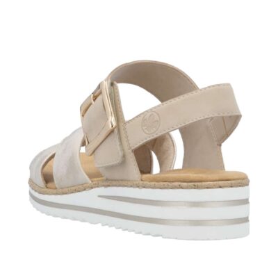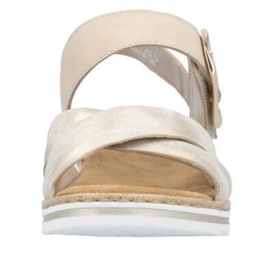 Rieker sandal til dame i beige. Moderne og feminin sandal i beige med smukke gulddetaljer, der skaber et stilfuldt udtryk. Sandalen har en krydsrem på forfoden samt en justerbar velcrorem, der gør den let at tage af og på. En hælrem og en blød indersål sikrer en god pasform og komfort. Den lette og fleksible konstruktion kombineret med en kilehæl på cirka 4 cm giver et elegant løft, mens den skridsikre ydersål med stødabsorbering sørger for ekstra stabilitet.