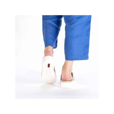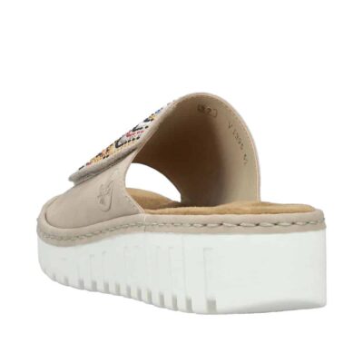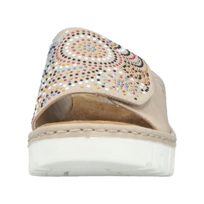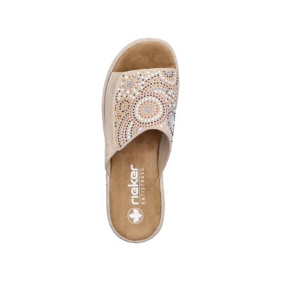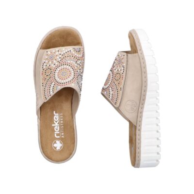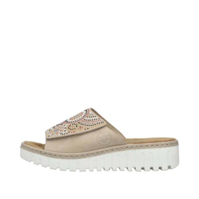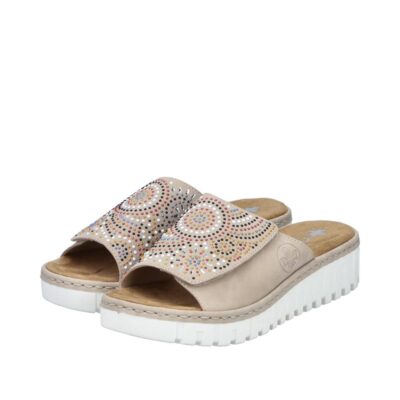 Rieker sandal til dame i beige. Elegant sandal i en smuk beige farve med fine palietter, der tilføjer et stilfuldt og moderne touch. Den brede rem over forfoden med velcro gør det nemt at justere pasformen for maksimal komfort. Indersålen er blød og behagelig, hvilket giver ekstra komfort hele dagen. Sandalen er designet med en smal pasform. Plateausålen på ca. 4,5 cm giver et sofistikeret løft, og den stødabsorberende ydersål med mønster sikrer både stabilitet og skridsikkerhed.