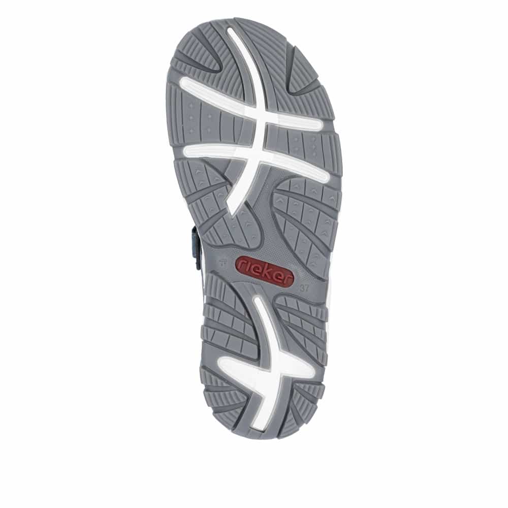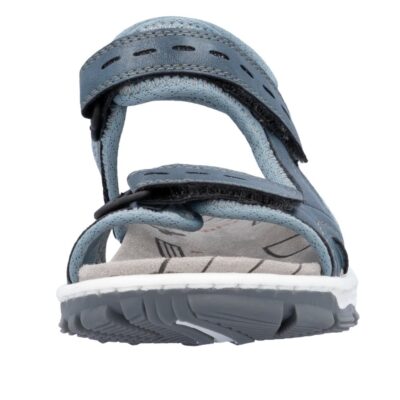 Rieker sandaler til dame i blå. Få komfort hele dagen med denne Rieker vandresandal, der er designet med funktionalitet og stil for øje. Med to velcroremme og en fleksibel TR-sål får du både nem tilpasning og stabilitet på alle overflader. Den stødabsorberende sål og den komfortable pasform gør denne sandal til et ideelt valg for aktive kvinder. En bestseller sandal fra Rieker.