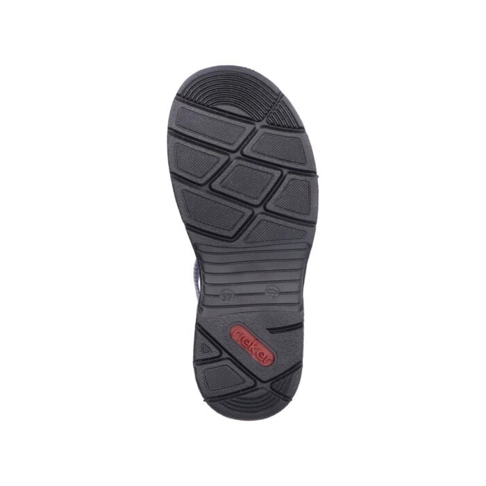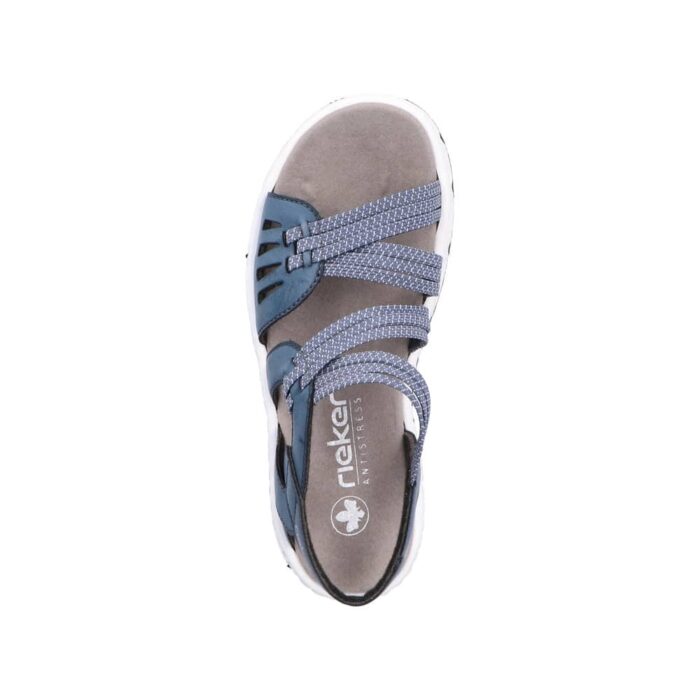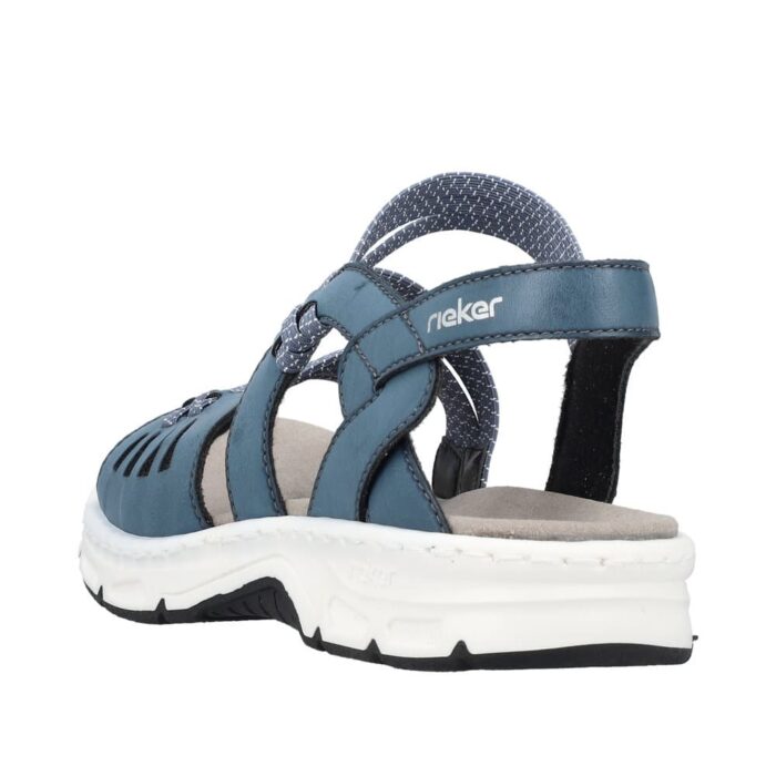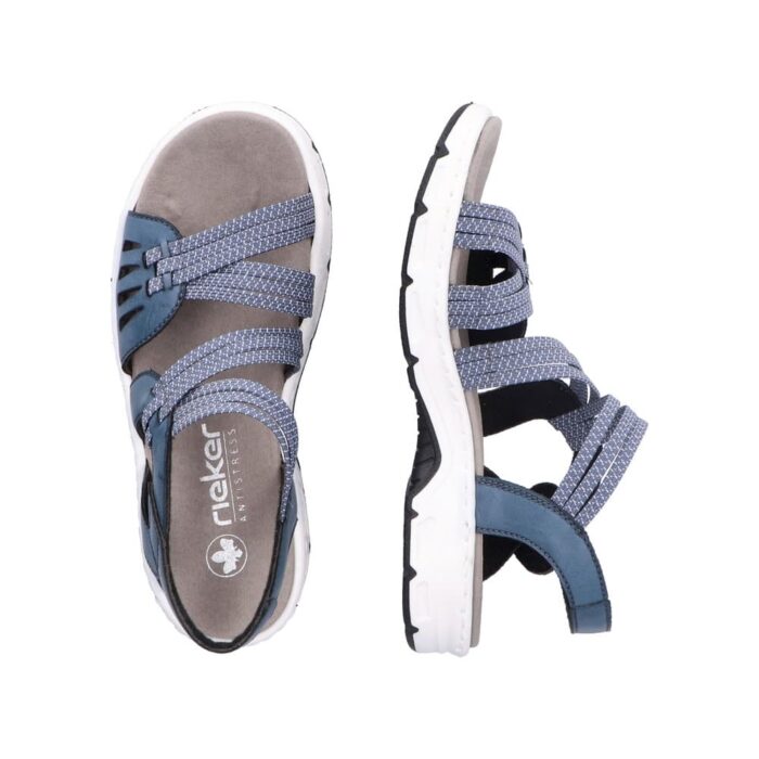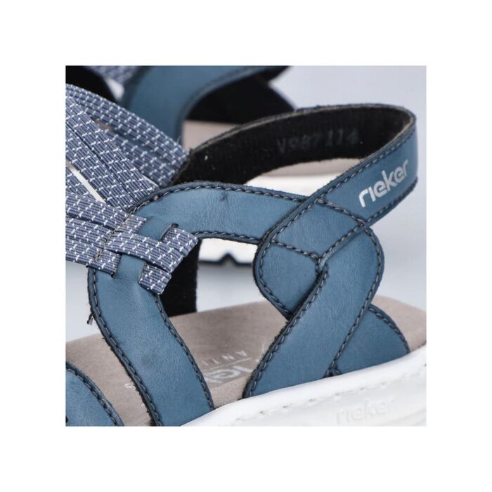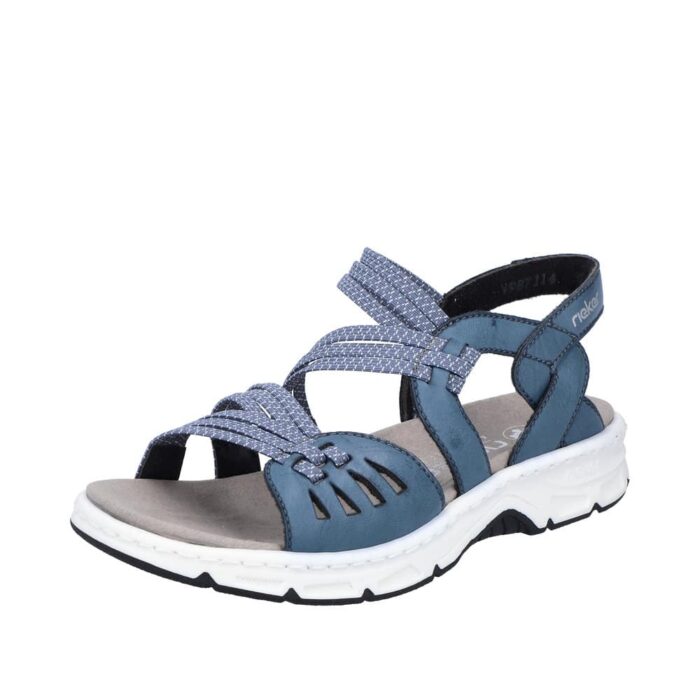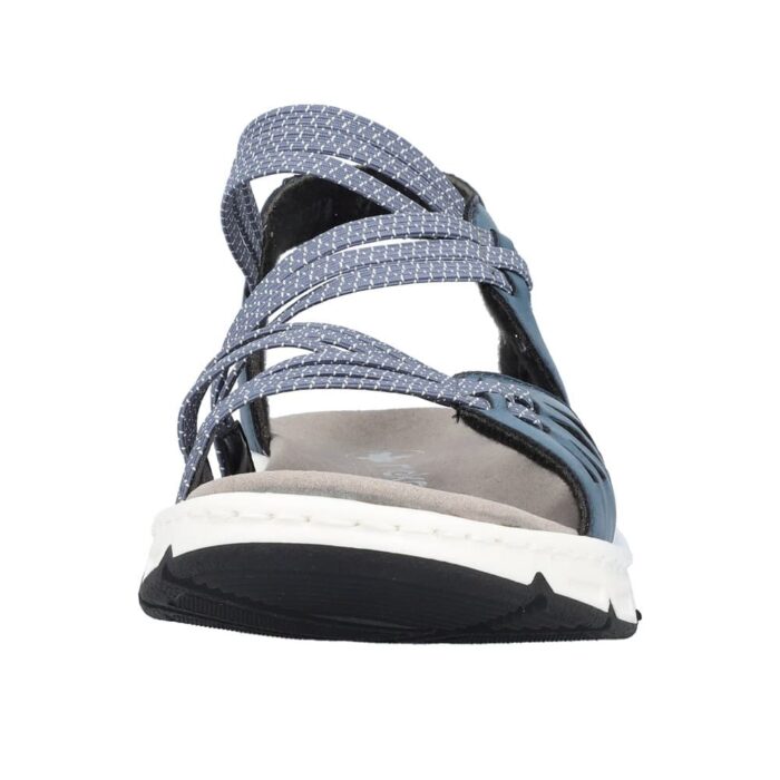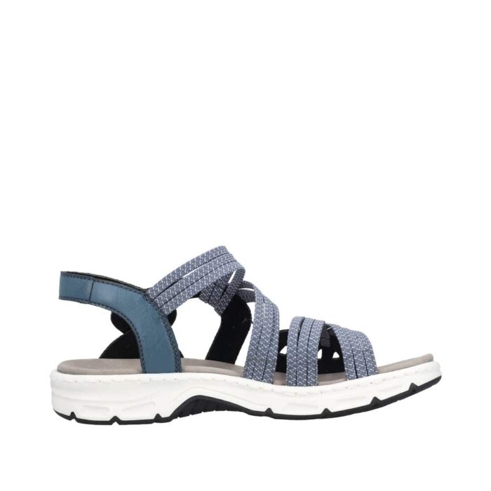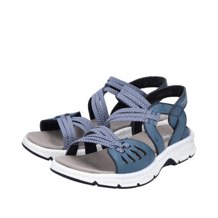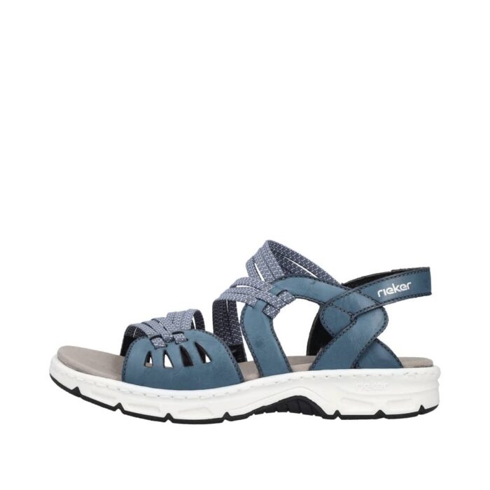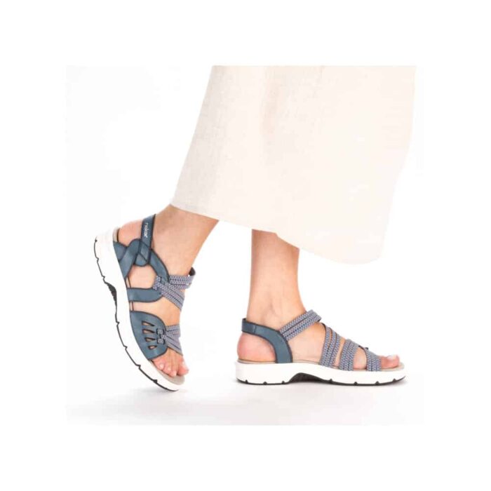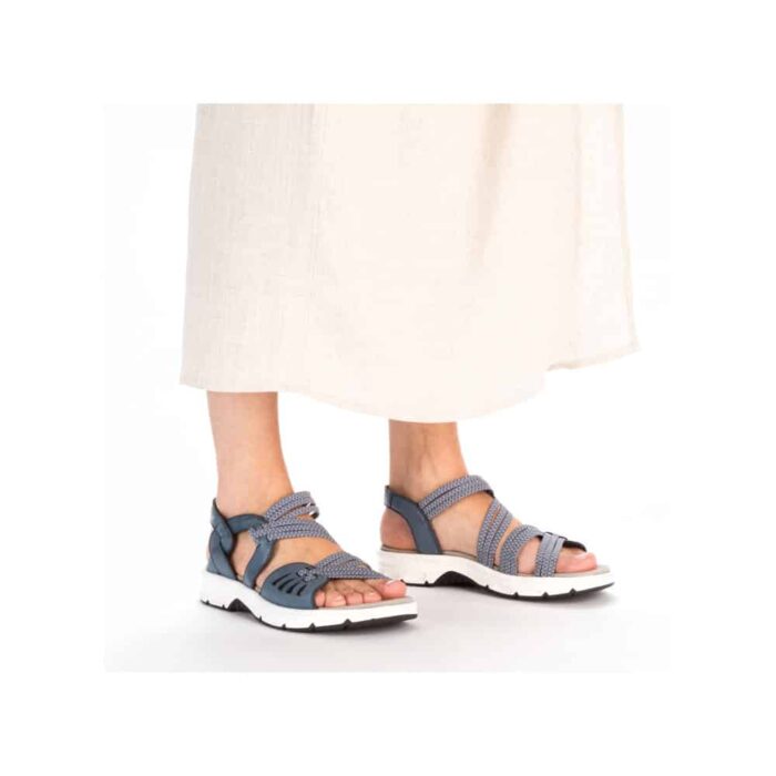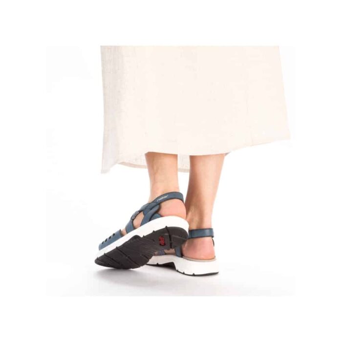 Rieker sandal til dame i blå. Perfekte til daglig brug, disse sandaler forener komfort og stil på en unik måde. Den elastiske indsats sikrer en behagelig pasform, mens den gribevenlige og stødabsorberende sål giver stabilitet og sikkerhed ved hvert skridt. Med en dejlig pasform, der tilbyder ekstra støtte, vil disse sandaler blive dine foretrukne til alle dine udendørs eventyr. Forkæl dig selv med både luksus og stil med disse Rieker sandaler!