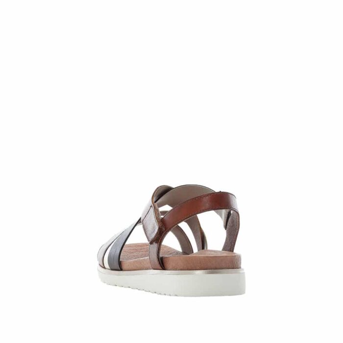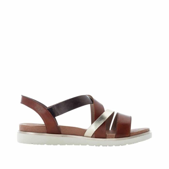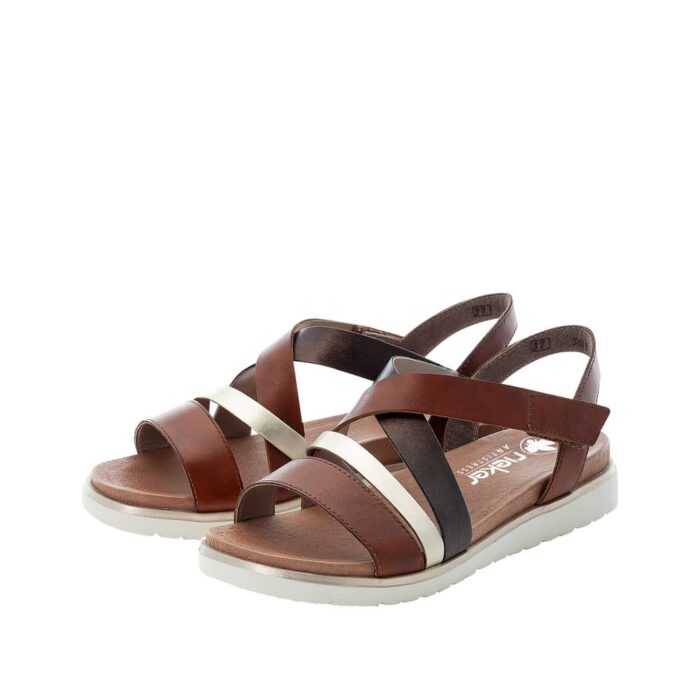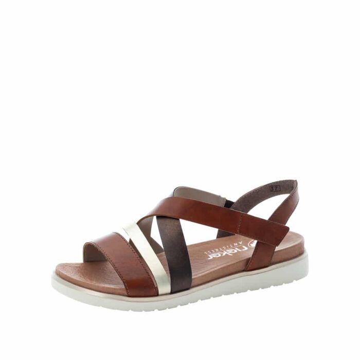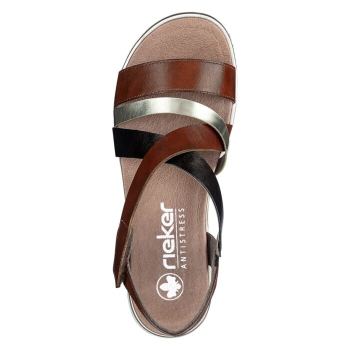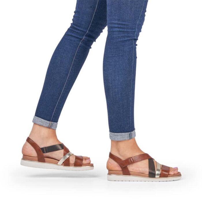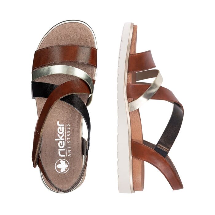 Rieker sandal i brun til dame. Med delikate remme, der krydser over foden i nuancer af brun, guld og mørk kobber, udstråler denne sandal en unik harmoni af farver og materialer. Den bløde indersål sikrer en behagelig gåoplevelse hele dagen lang. For ekstra bekvemmelighed har sandalen en diskret velcrobåndlukning på ydersiden, så du let kan justere pasformen. Den lette og bløde sål gør den til det perfekte valg til alt fra lange gåture til afslappede udflugter. Med vores brune damesandal får du ikke kun stil, men også en sand fornøjelse for dine fødder.