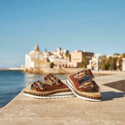 Rieker sandal til dame i brun. Fuld af elegance og komfort, denne sandel med læderoverdel og en lille kilehæl på cirka 5 cm er perfekt til varme dage. Med justerbare velcro-remme og praktisk slip-on funktion bliver det både nemt og hurtigt at tage sandalen på. De smukke guldspændedetaljer tilføjer et eksklusivt touch, mens den stødabsorberende bund sikrer, at du kan have sandalen på hele dagen uden problemer.