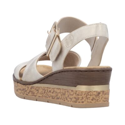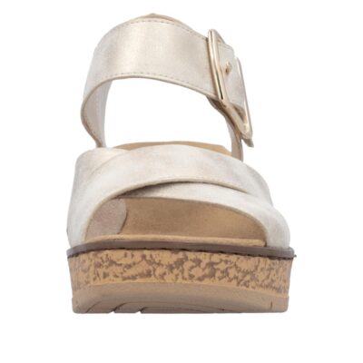 Rieker sandal til dame i guld. Stil og komfort forenes i denne smukke Rieker sandal i en skinnende guld nuance. Den dekorative spænde i guld giver et elegant præg, mens den praktiske velcrolukning sikrer en god pasform. Med en 5 cm høj kilehæl og en blød sål under foden, får du både støtte og komfort, uanset om du er på farten eller nyder solen i byen.