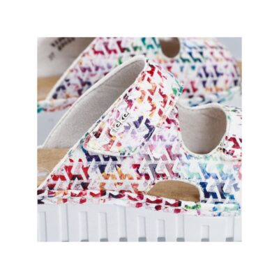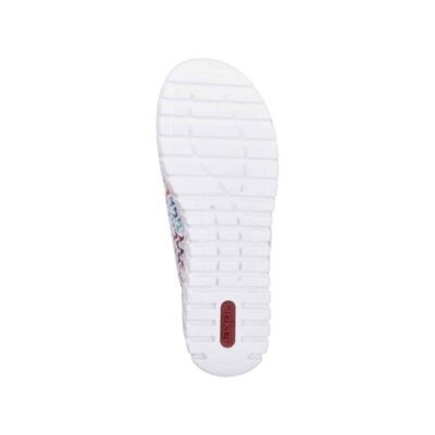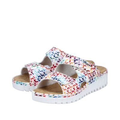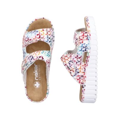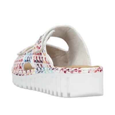 Rieker sandal til dame i hvid med farvekombination. Disse farverige Rieker sandaler til damer er perfekte til sommerens mange aktiviteter. Det klassiske design med flettet struktur giver en flot og fleksibel pasform, mens de to praktiske velcrolukninger gør det hurtigt at komme ud ad døren. Sandalen er udstyret med en blød, tekstilbeklædt indersål og en kilehæl, som sammen med den stødabsorberende sål giver en behagelig oplevelse hele dagen. Den smalle læst sikrer, at foden holdes godt på plads – også ved længere tids brug.