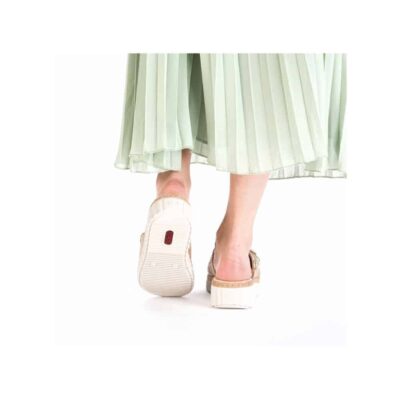 Rieker sandal til dame i en flot farvekombination. Stilfuld sandal i en flot kombination af farver med fine detaljer, der fuldender det elegante design. Den brede velcrorem over forfoden gør det let at justere pasformen, så den sidder perfekt. Indersålen er behageligt polstret og har ekstra vidde (H), der giver en rummelig og afslappet pasform. Plateausålen på cirka 4,5 cm løfter elegant, mens den mønstrede ydersål med stødabsorbering sikrer komfort og stabilitet hele dagen.