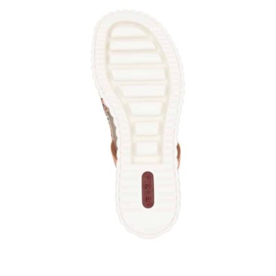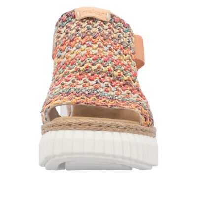Rieker sandal til dame i orange farver. Denne sandal kombinerer et unikt design med høj komfort. Overdelen i flerfarvet vævet materiale tilføjer et levende og personligt touch, mens elastikken giver en fleksibel og behagelig pasform. Med en hælhøjde på 5 cm og en stødabsorberende sål får du både stil og støtte i ét. Sandalen er perfekt til både hverdagsbrug og sommerens festlige anledninger.