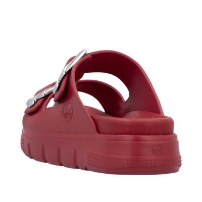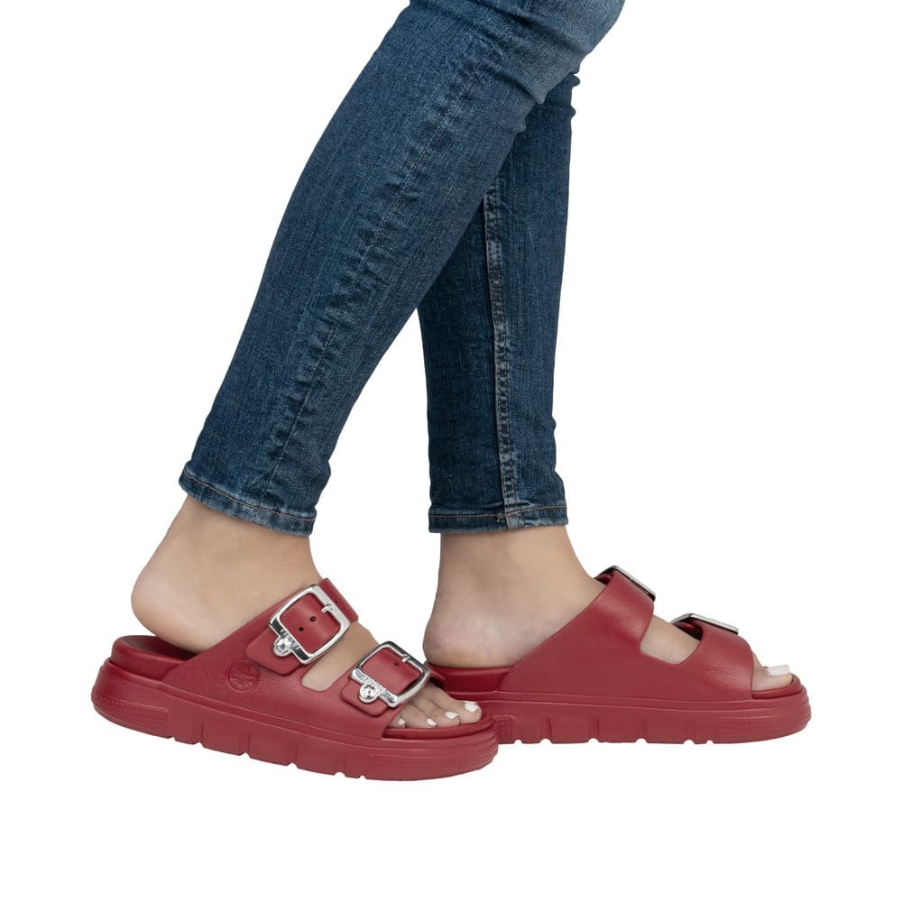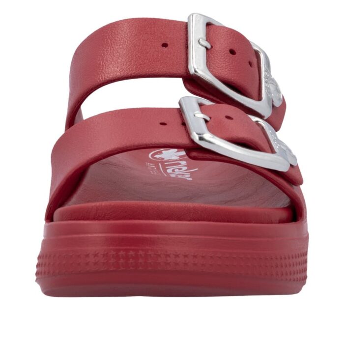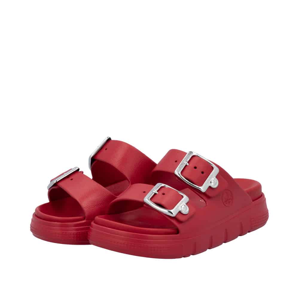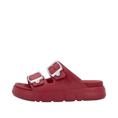 Rieker sandal til dame i rød. Med sit stilrene design og friske røde farve er denne sandal perfekt til dig, der vil kombinere klassisk look med moderne komfort. De to justerbare spænder sikrer, at pasformen tilpasses nemt, mens slip-in funktionen gør sandalen praktisk til hverdagsbrug. Den bløde indersål giver komfort hele dagen, og den chunky EVA-ydersål på 4,5 cm sørger for stabilitet. Takket være stødabsorbering og en mønstret sål får du både sikkerhed og stil i ét.