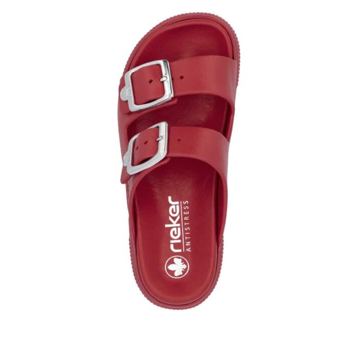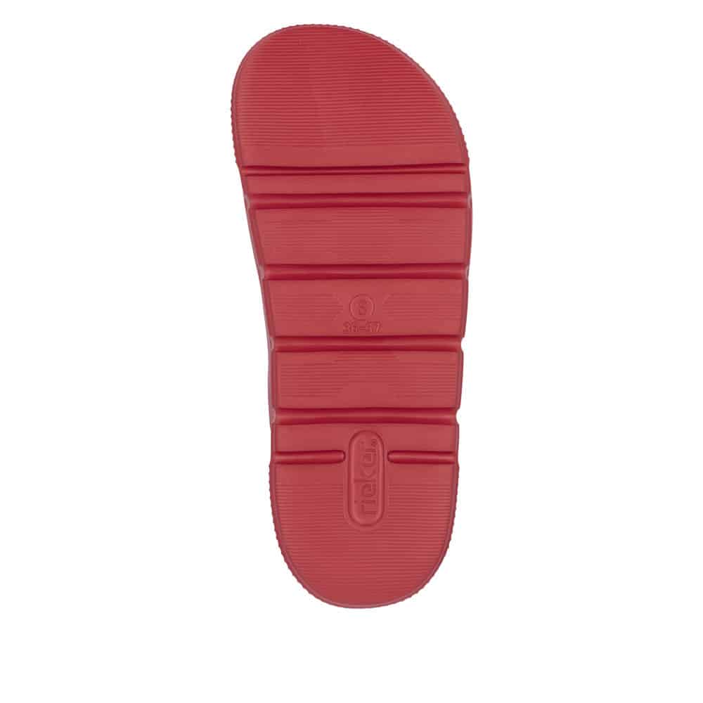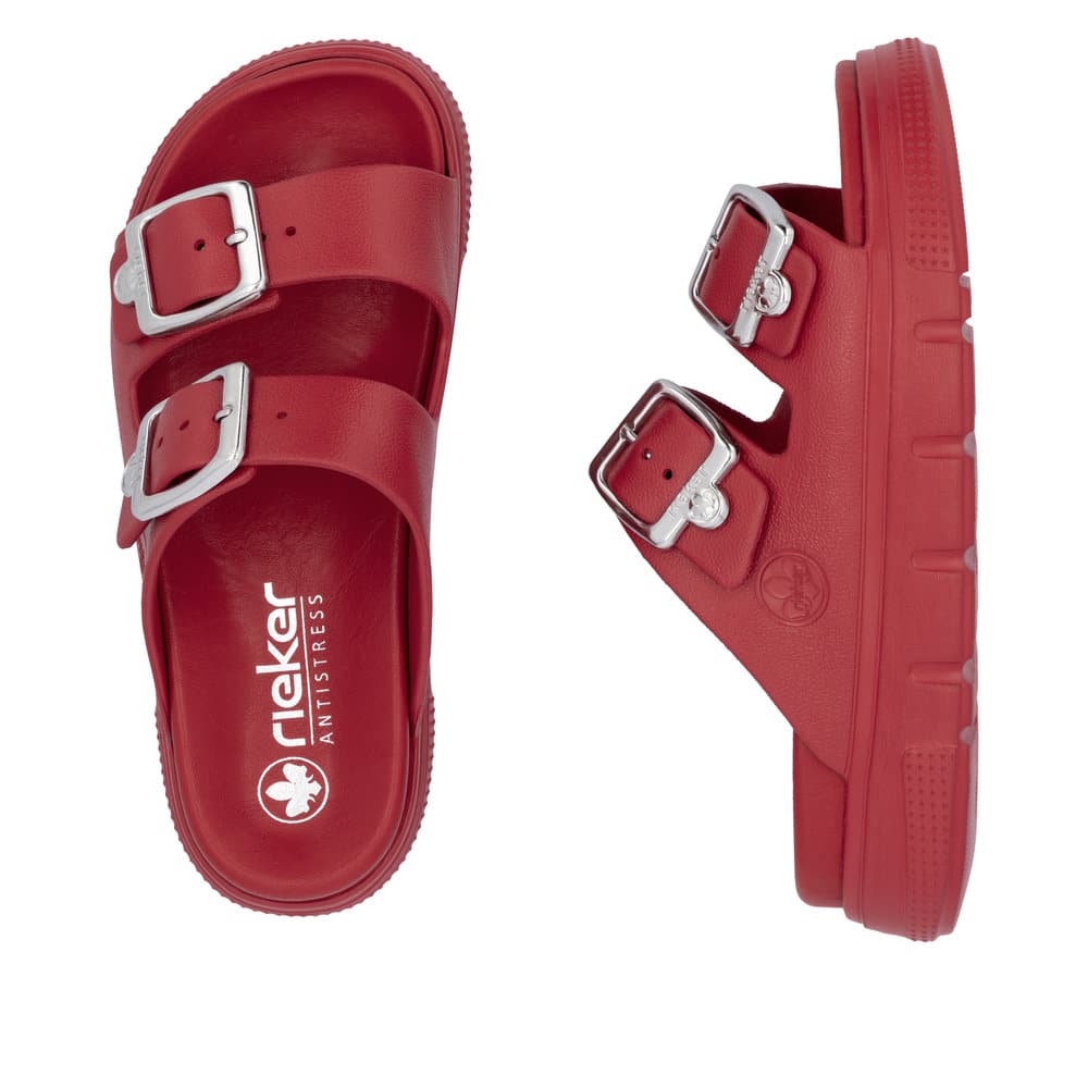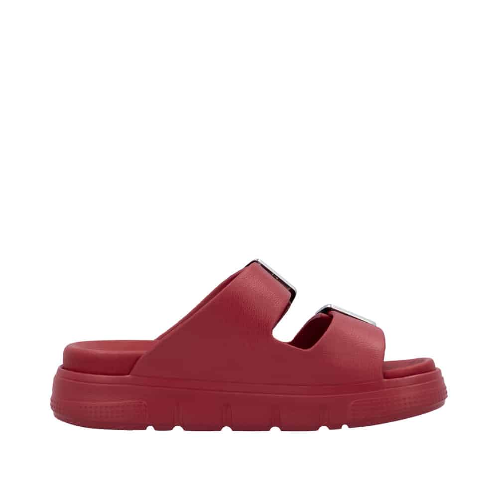 Rieker sandal til dame i rød. Med sit stilrene design og friske røde farve er denne sandal perfekt til dig, der vil kombinere klassisk look med moderne komfort. De to justerbare spænder sikrer, at pasformen tilpasses nemt, mens slip-in funktionen gør sandalen praktisk til hverdagsbrug. Den bløde indersål giver komfort hele dagen, og den chunky EVA-ydersål på 4,5 cm sørger for stabilitet. Takket være stødabsorbering og en mønstret sål får du både sikkerhed og stil i ét.