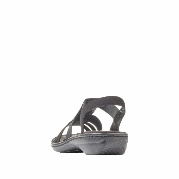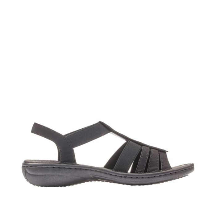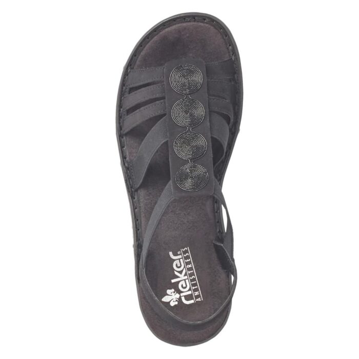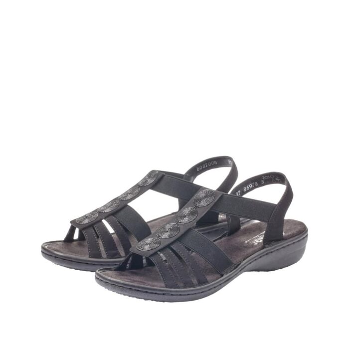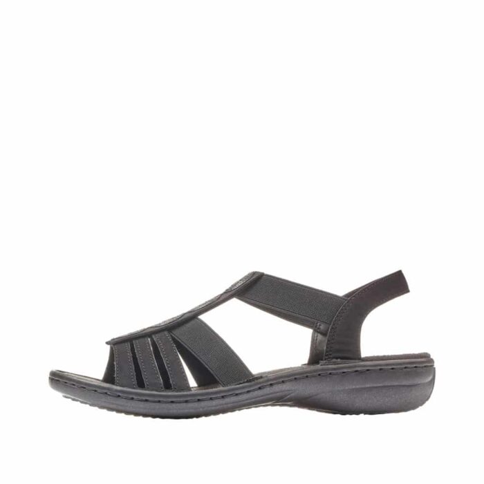 Rieker sandal i sort til dame. Denne sorte Rieker rem-sandal til kvinder skiller sig ud med deres unikke design og er samtidig utroligt komfortable til daglig brug. Elastikindsatsen gør det let at tage dem af og på. Det cirkulære broderi på den midterste rem tilføjer et elegant præg til designet. Den fleksible, stødabsorberende og lette sål sikrer en behagelig gåkomfort, selv efter lang tids brug. Med den slanke pasform E 1/2 får foden god støtte i skoen. Så lad de varme dage blive endnu mere fornøjelige!