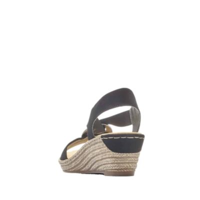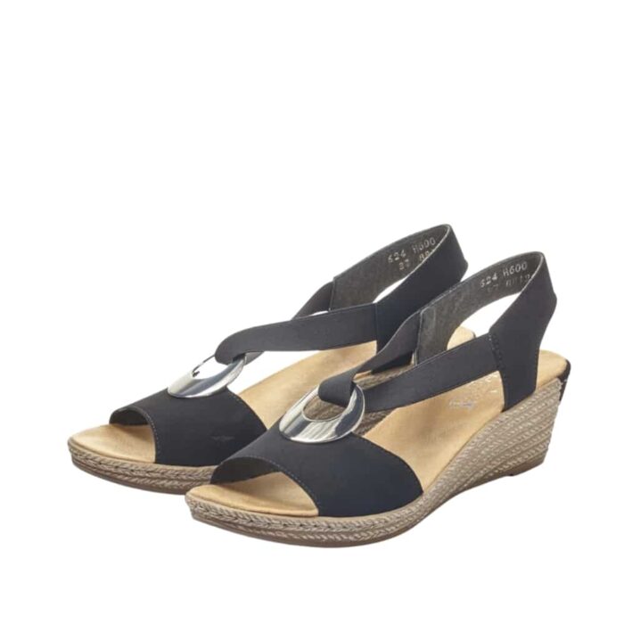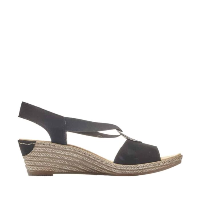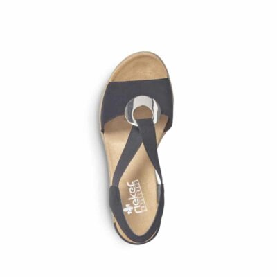 Rieker sandal til dame i sort. Denne elegante sandal kombinerer stil og komfort på bedste vis. De to elastiske remme foran samles af en flot sølvfarvet detalje, der tilfører et moderne udtryk. Den bløde indersål sikrer høj komfort hele dagen, mens den stødabsorberende sål giver optimal støtte. Med en 5,5 cm kilehæl får du et smukt løft uden at gå på kompromis med bekvemmeligheden.