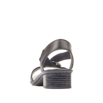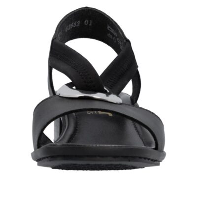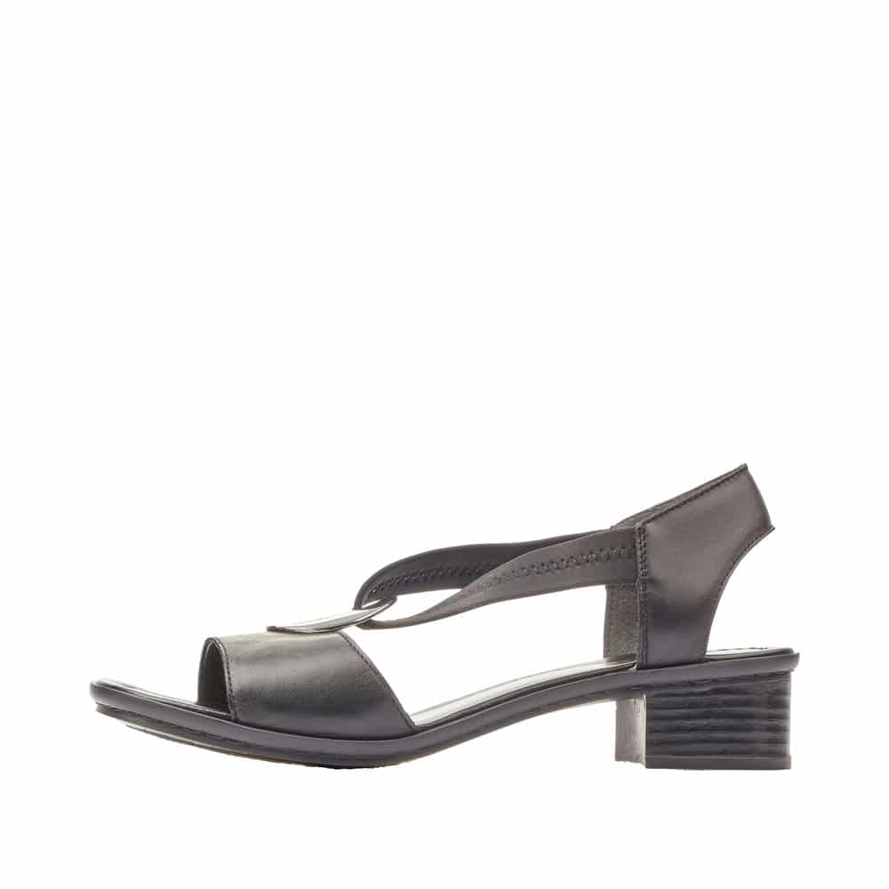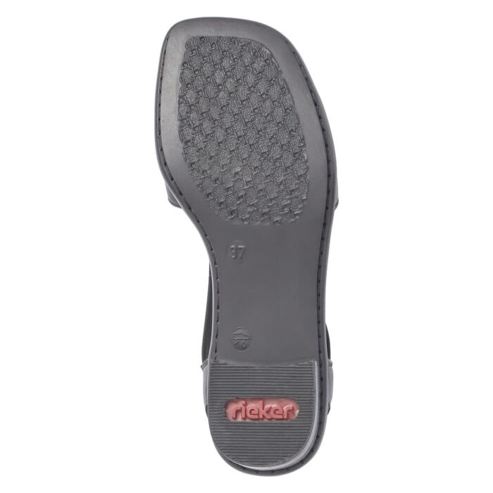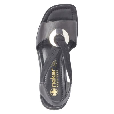 Rieker sandal i sort til dame. Disse sorte Rieker sandaler i glat læder er nøje fremstillet med omhu. Takket være elastikindsatsen er de lette at tage af og på. Remmen i midten, udsmykket med et cirkulært smykkeelement, tilføjer en ekstra dimension af stil. Med den stødabsorberende og lette sål vil dine fødder nyde den bedste gåkomfort ved hvert eneste skridt. Sandalen har en slank pasform (E 1/2), hvilket giver god støtte til foden. Med en lækker ca. 4 cm blokhæl har disse sandaler 100% potentiale til at blive dine favoritter.