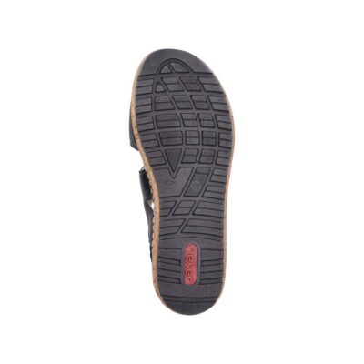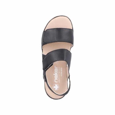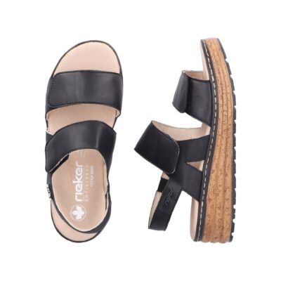 Rieker sandal til dame i sort. Stilfuld og komfortabel Rieker sandal i en moderne sort farve. Sandalen har velcrolukninger ved både anklen og forfoden, hvilket gør det nemt at opnå en individuel pasform. Den 4,5 cm høje kilehæl giver et diskret løft, mens læderoverdelen og den bløde skindsål sikrer en lækker fornemmelse mod foden. Den fleksible, stødabsorberende sål bidrager til en behagelig gangoplevelse dagen lang.