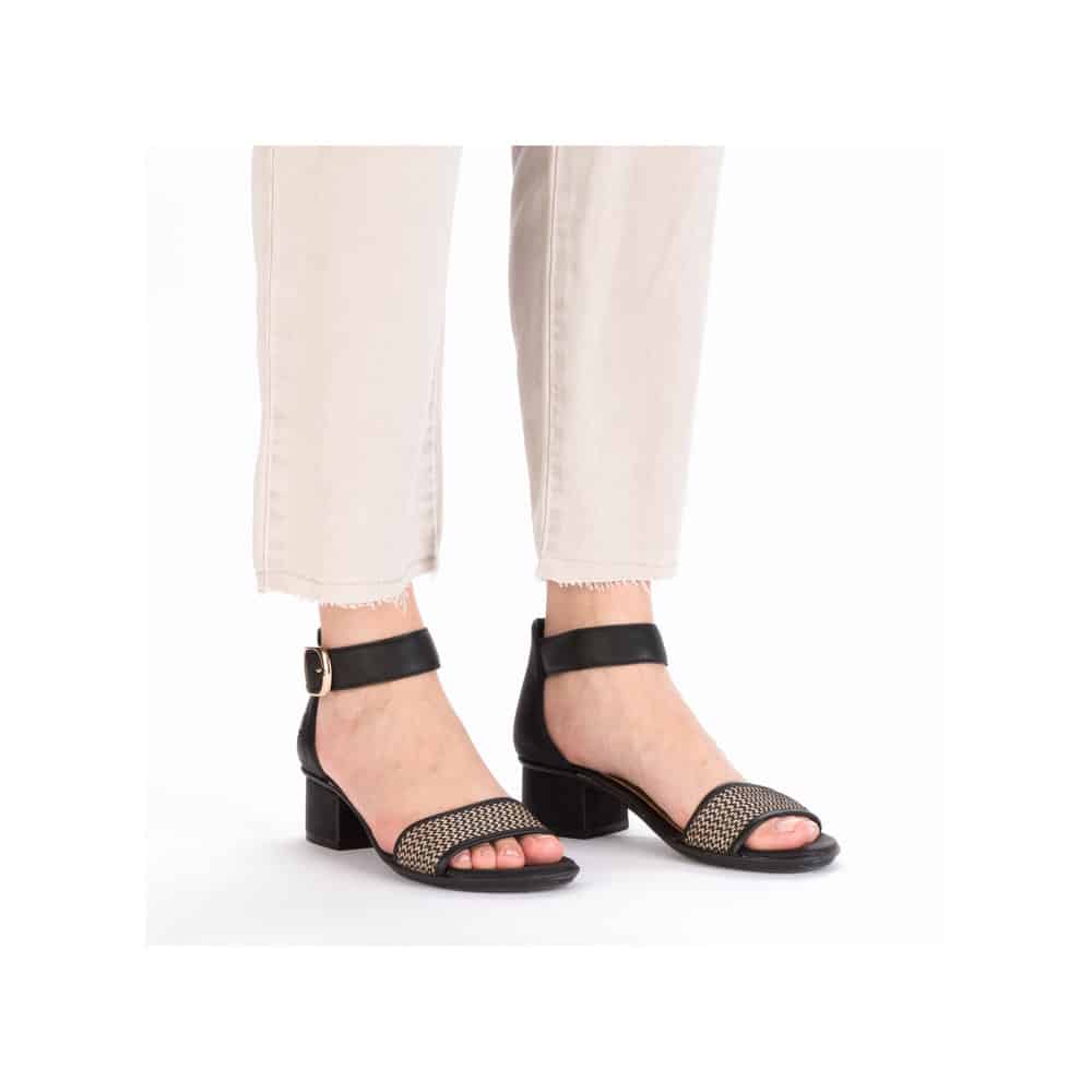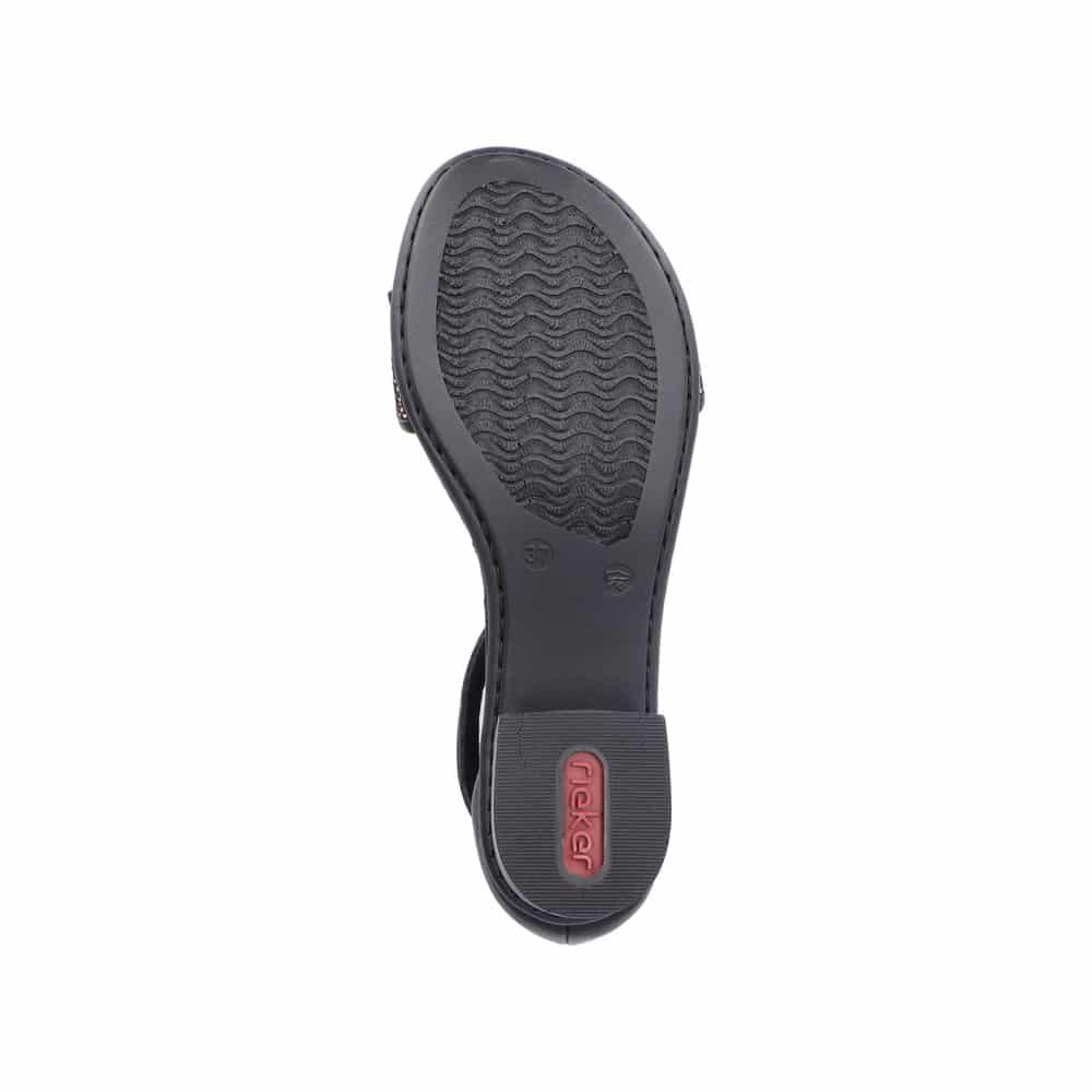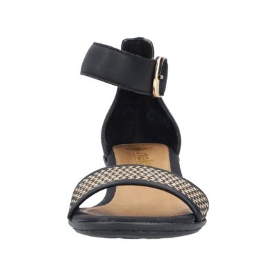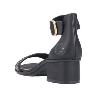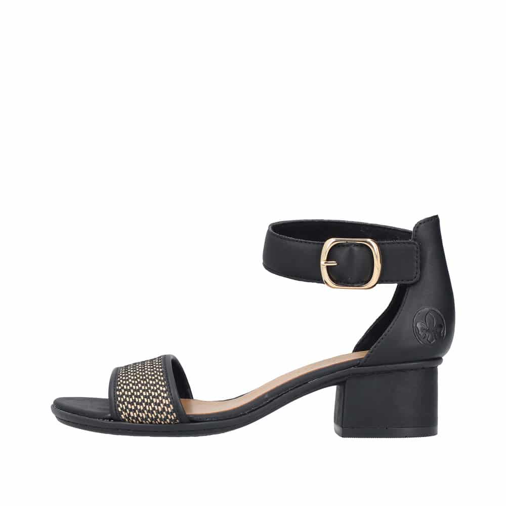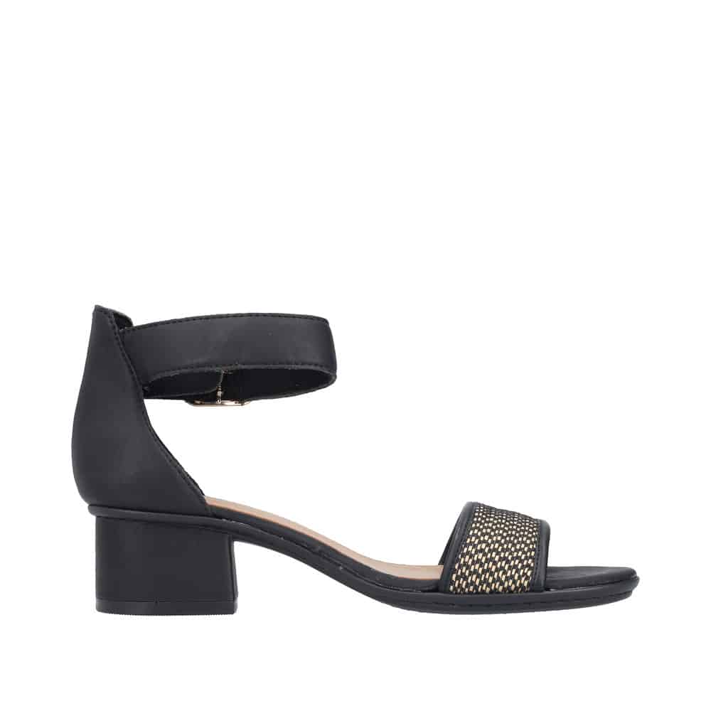 Rieker sandal til dame i sort. Denne moderne sandal kombinerer klassisk sort med et elegant guldfarvet mønster, der pynter remmen over forfoden. En velcrorem omkring anklen, pyntet med en gylden spænde, gør sandalen nem at tage på og sikrer, at den sidder godt på foden. Den bløde indersål giver komfort hele dagen, mens blokhælen på ca. 4,5 cm tilføjer et sofistikeret løft. Ydersålen med stødabsorbering og rillet mønster sørger for øget stabilitet og skridsikkerhed, uanset hvor dagen bringer dig hen.