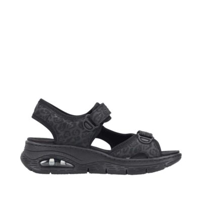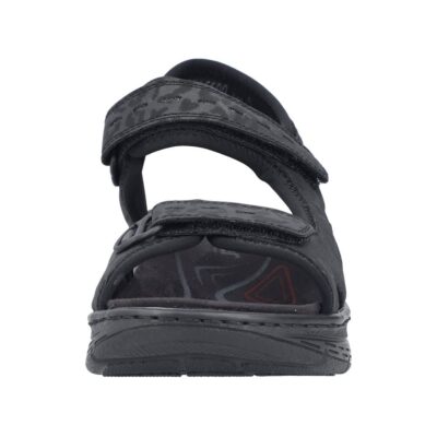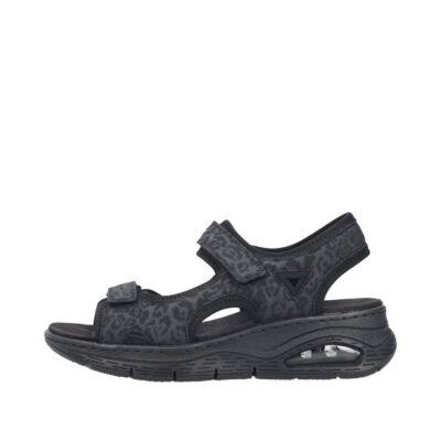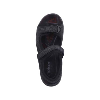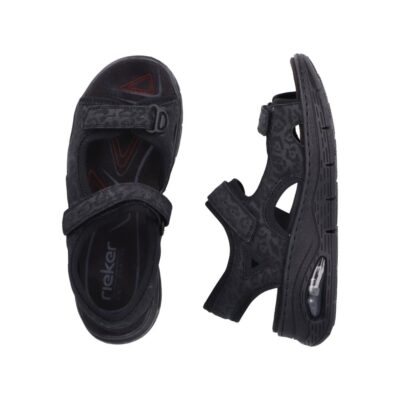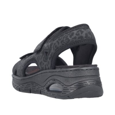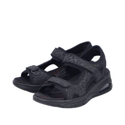 Rieker sandal til dame i sort. Denne sorte sandal kombinerer lethed og komfort med et moderne design. De to velcroremme gør det nemt at justere pasformen og tage sandalen af og på. Indvendigt sikrer den bløde indersål maksimal komfort, mens kilehælen på ca. 5 cm med Rieker Air giver ekstra støtte og et flot look. Ydersålen har stødabsorberende egenskaber, der giver optimal komfort gennem hele dagen.