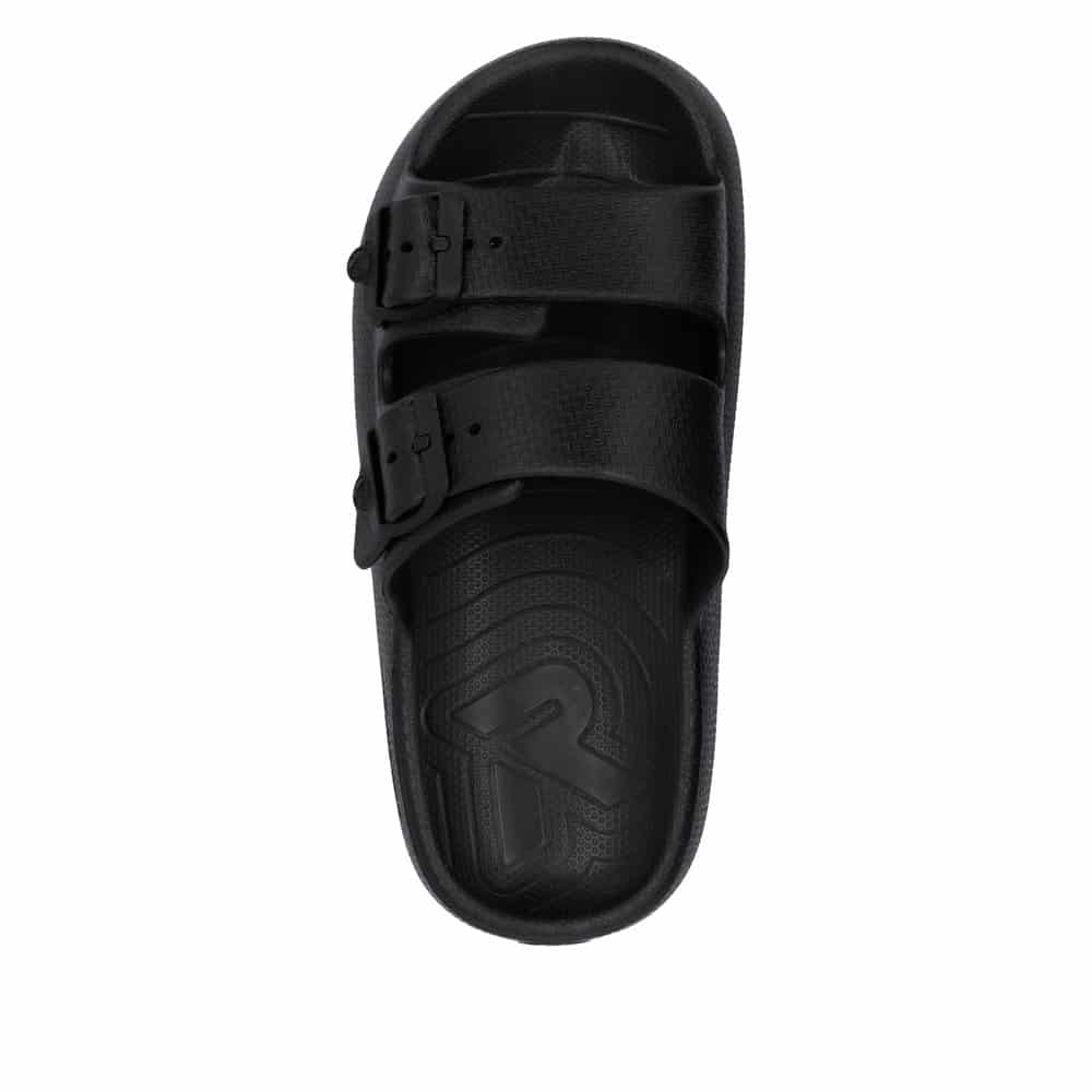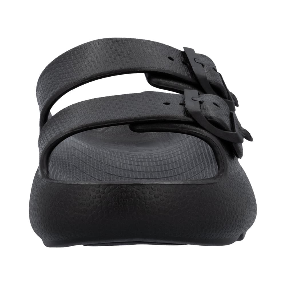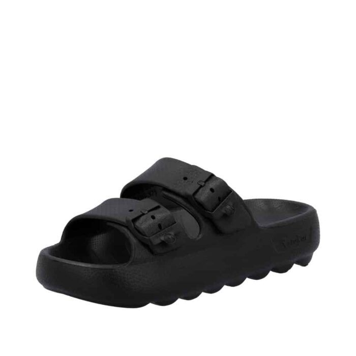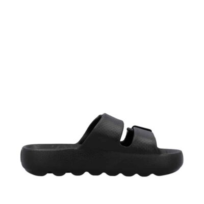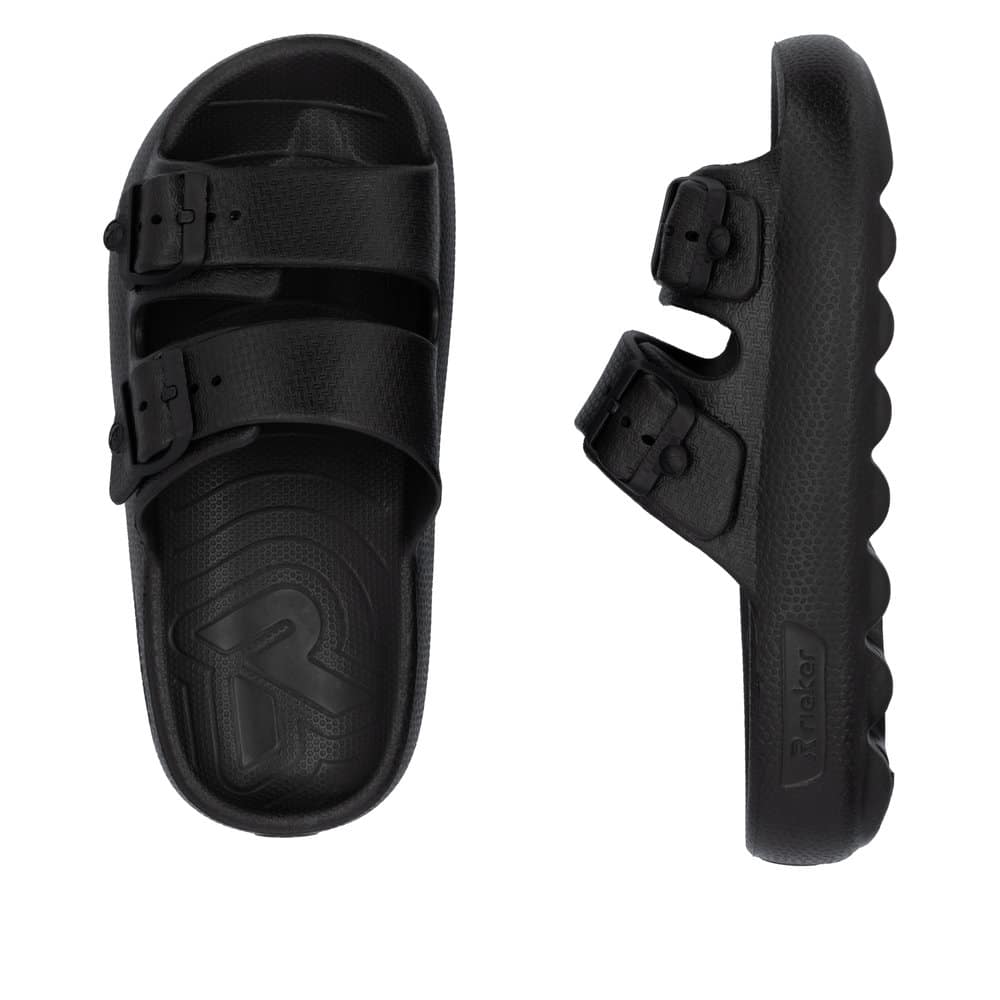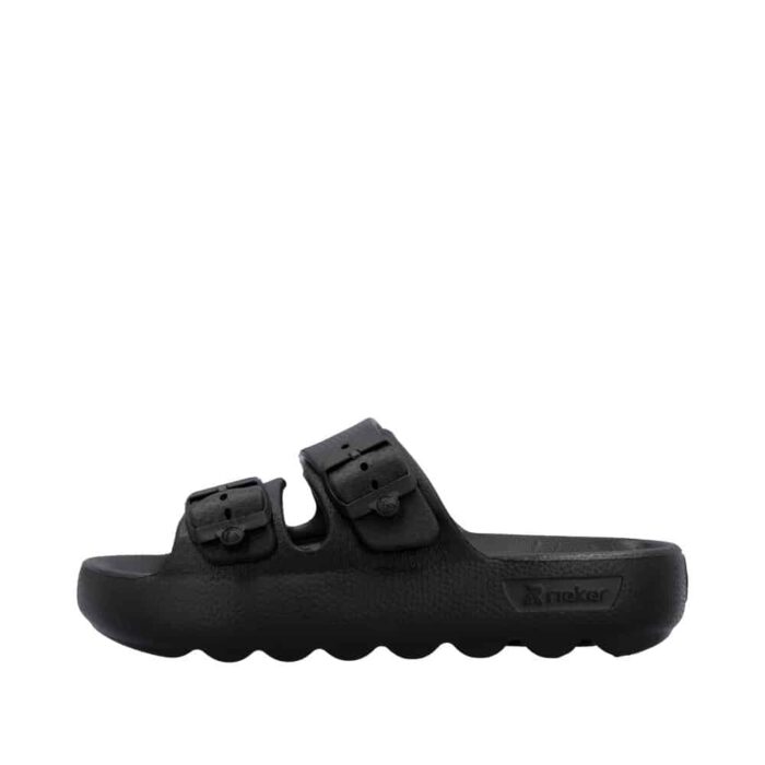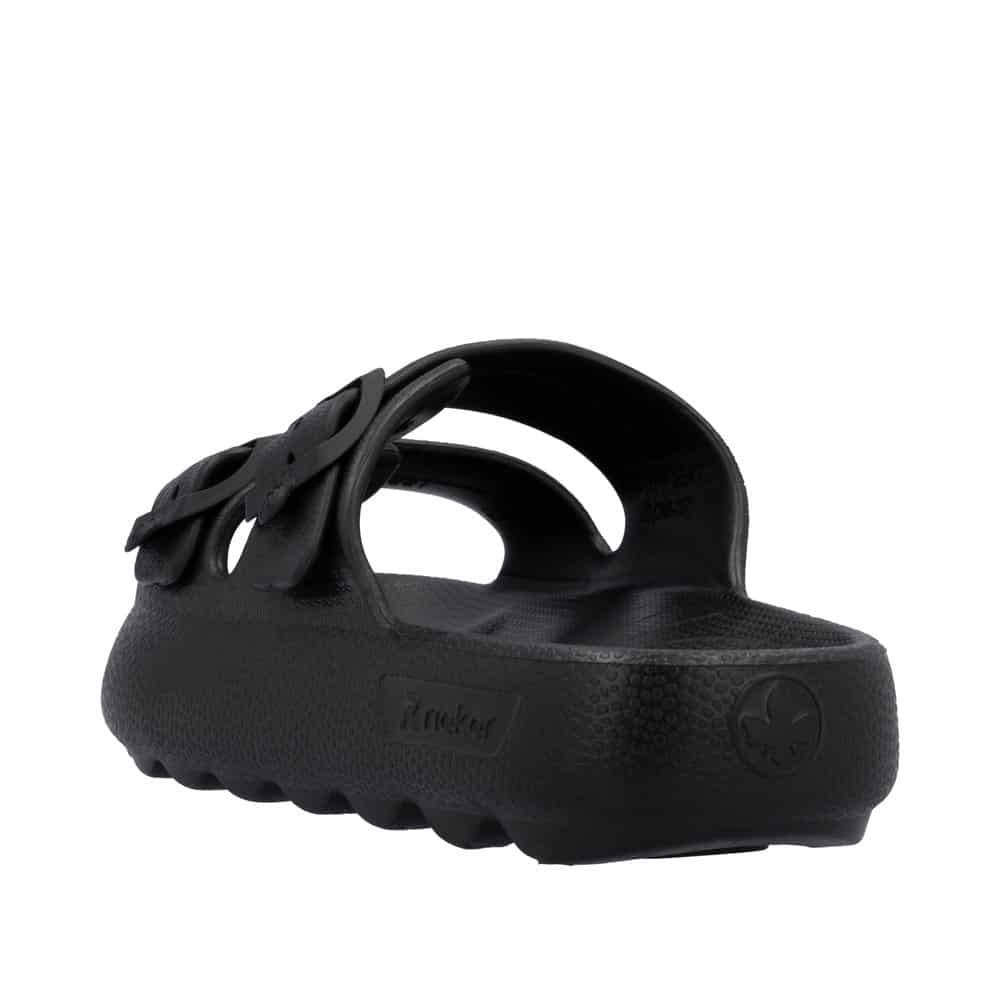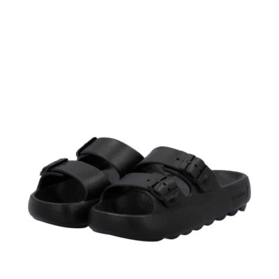 Rieker sandal til dame i sort. Moderne sandal der kombinerer både stil og fleksibilitet. Sandalen er let og behagelig med justerbare spænder, så pasformen kan tilpasses individuelt. Den bløde plateausål på ca. 4 cm er skridsikker og giver et elegant løft, mens du stadig får optimal komfort.