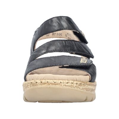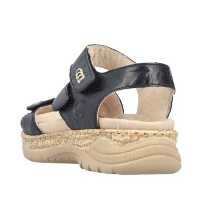 Rieker sandal til dame i sort. Lad dine fødder nyde en kombination af elegance og velvære med denne sorte sandal i moderne design. Den bløde skindoverdel og de tre velcroremme sikrer både fleksibilitet og en god pasform. Indvendigt forkæles du med en nopret, blød indersål, der giver en let masserende effekt og sålen kan tages ud efter behov. Den ca. 5 cm høje kilehæl giver dig et løft med komforten i behold, mens ydersålen med stødabsorbering og skridsikkert mønster giver tryghed i hvert skridt.