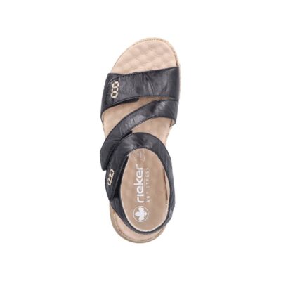 Rieker sandal til dame i sort skind, med udtagelig sål og kilehæl på 5 cm