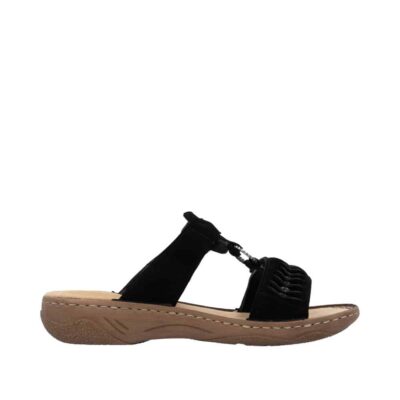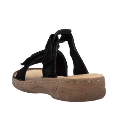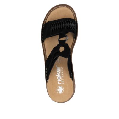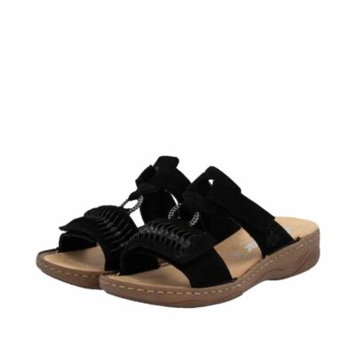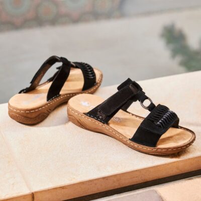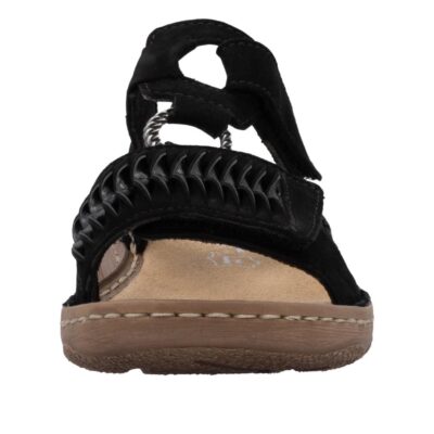 Rieker sandal til dame i sort. Moderne damesandal i sort, designet med flotte detaljer, der giver et smart look. Den lette skindoverdel føles behagelig mod foden, mens slip-in funktionen gør den nem at tage på. De to velcroremme giver mulighed for en justerbar pasform, så du får optimal komfort. Sandalen har en blød indersål, mens den stødabsorberende sål med et godt mønster sikrer en stabil og behagelig gangoplevelse.