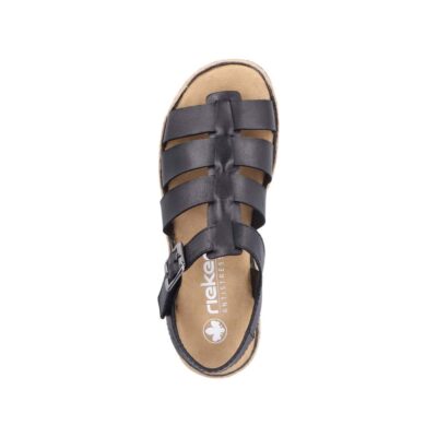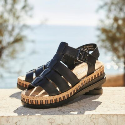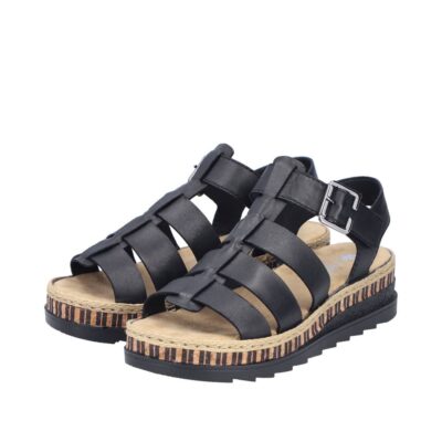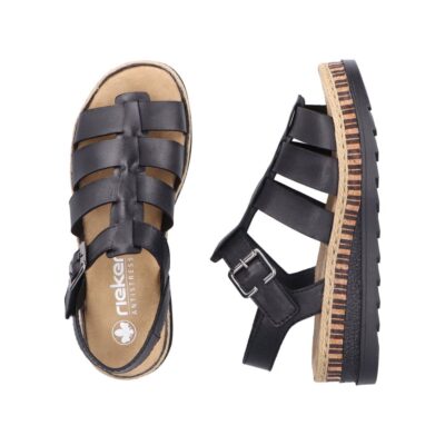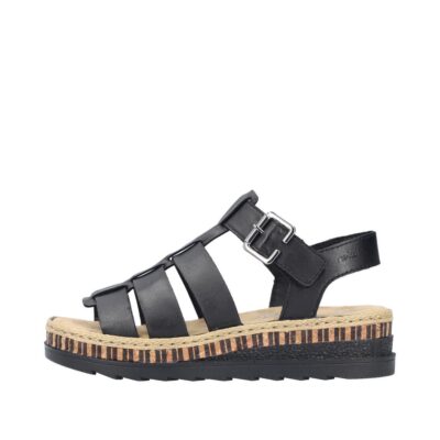Rieker sandal til dame i sort. Denne stilfulde sandal fra Rieker er skabt til både komfort og elegance. Den kommer i en klassisk sort farve med en blød skindoverdel, der føles behagelig mod foden. Sandalen har smukke detaljer som remme over forfoden og en dekorativ spænde på velcroremmen ved anklen. Den justerbare velcrolukning gør den nem at tage af og på, mens den bløde indersål og den stødabsorberende sål sikrer optimal komfort. Med en kilehæl på cirka 4,5 cm får du et elegant løft, og den mønstrede ydersål giver ekstra stabilitet og skridsikkerhed.
