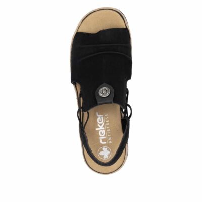 Rieker sandal til dame i sort. Denne fine sandal er udstyret med elastik-snøre, så du nemt og hurtigt kan komme i/af sandalen samtidigt med at den passet til enhver fodtype. Sandalen er fremstillet i bløde kvalitetsmaterialer samt en lille kilehæl på ca. 5 cm, der er med til at sikre den optimale komfort for dine fødder dagen lang. Med sine flotte detaljer er dette en sandal, som kan bruges både til hverdag og de kommende fester. Med sin bløde sål og stødabsorberende bund, er dette en sko dine fødder ikke kan undvære.