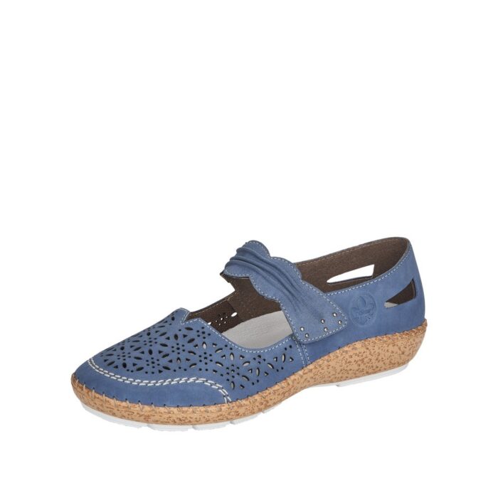 44896-15 Rieker Sko i Blå til Dame. Dejlig let og blød sko, i en lækker blå farve. Modellen har en velcrolukning, som gør det let at komme i/af skoen. Modellen har en lækker blød sål, som gør det behageligt at gå i skoen. Modellen har en overdel af skind.