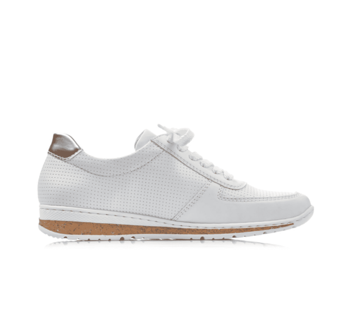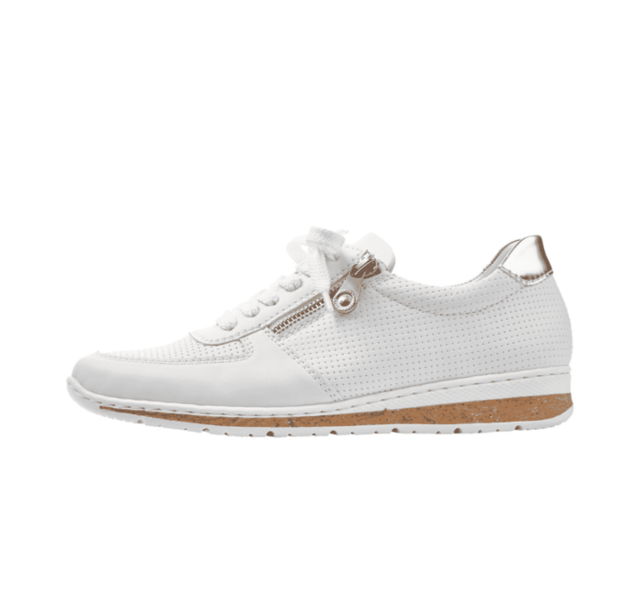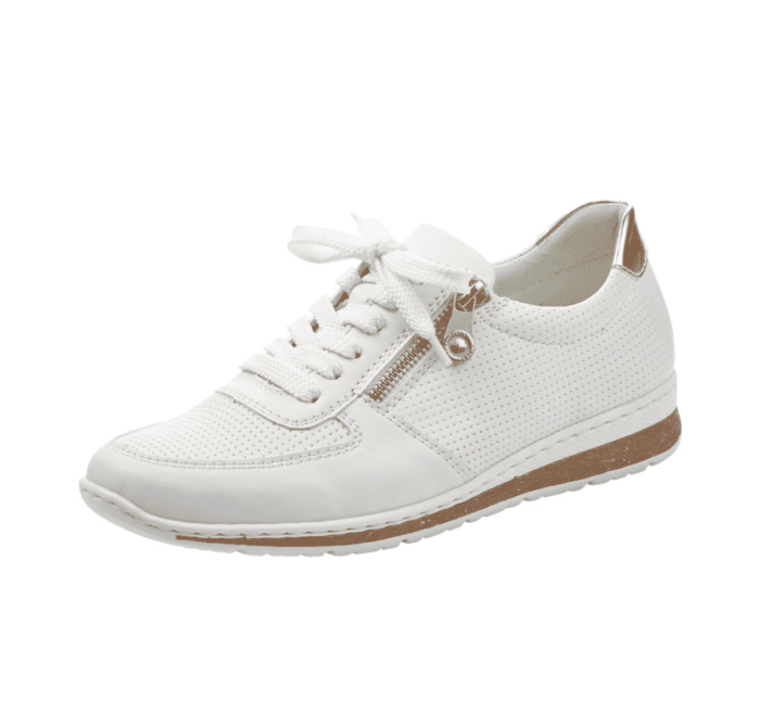 N5121-80 Rieker Sneakers Hvid Til Dame. Modellen er i en flot hvid farve og har snøre, samt lynlås så de er nemme at få på. Dejligt bløde og sølv detaljer i sålen.