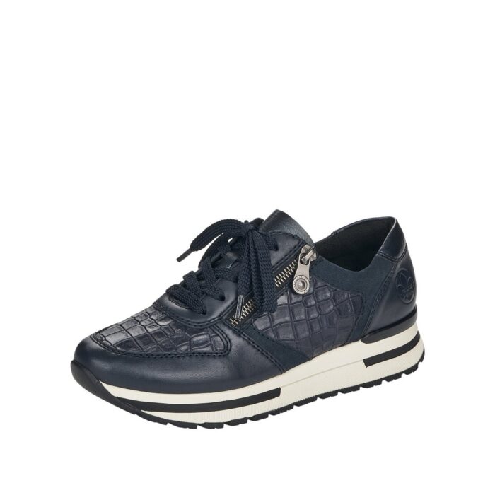 N7811-14 Rieker Sneakers i Blå til Dame. Dejlig let og blød sneakers, i en super flot blå farve. Modellen har en lynlås på ydresiden, som gør det let at komme i/af skoen. Modellen har en dejlig pasform, og er almindelig i størrelsen. Skoen har flotte detaljer, rundt på hele skoen.