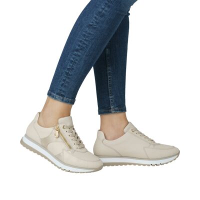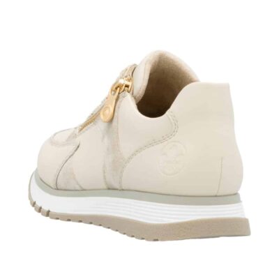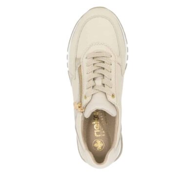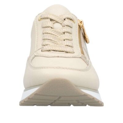 Rieker sneakers til dame i beige. Med en elegant skindoverdel er disse sneakers skabt til både komfort og stil. De har både snørebånd og en praktisk gylden lynlås, der gør det let at tage skoene på og sikrer en perfekt pasform. Den lækre Rieker Antistress-sål giver maksimal komfort og et godt fodfæste dagen igennem. Skoene er udstyret med en blød, udtagelig indersål, der kombinerer funktionalitet med komfort. Takket være den ekstra brede pasform (H) er der en dejlig rummelighed ved tæerne.