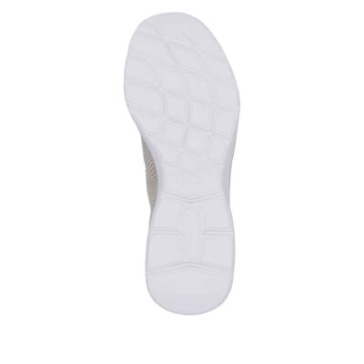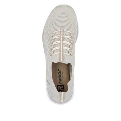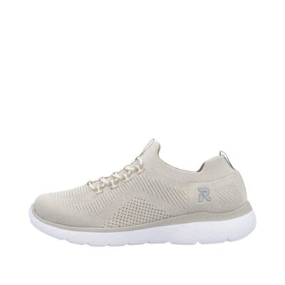 Rieker sneakers i beige til dame. Denne model er fremstillet i tekstil af høj kvalitet og består udelukkende af 100 % veganske materialer, hvilket gør den til et bæredygtigt og moderne valg. Skoen er designet med elastikbånd og en fleksibel skaftekant, der gør det nemt at tage dem af og på. Den ultralette og fleksible EVA-sål sikrer fremragende bevægelighed og komfort ved hvert skridt. Den bløde Memosoft-indersål former sig efter foden for en skræddersyet pasform, mens komfortbredden (G – G ½) giver ekstra plads og støtte. En ideel kombination af stil, komfort og bæredygtighed – perfekt til enhver dag.