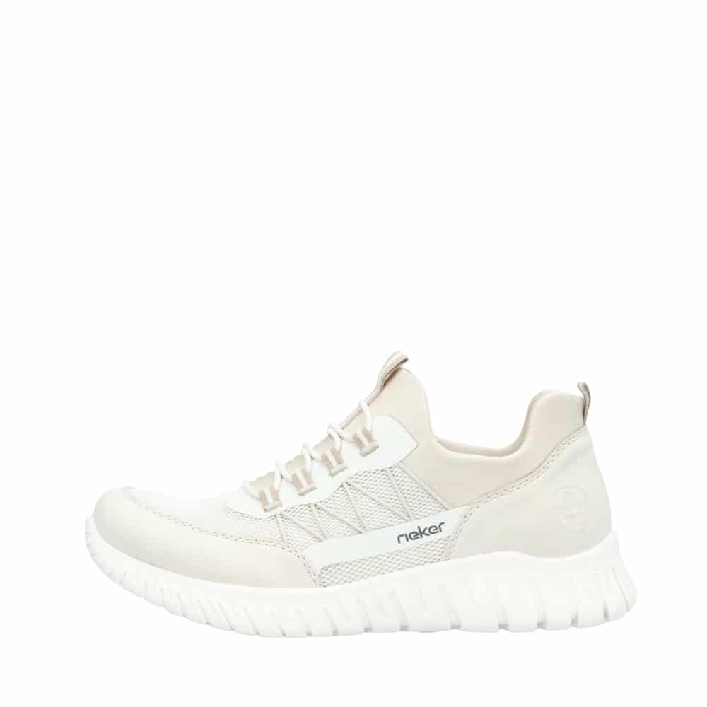 Rieker sneakers til dame i beige. Flot beige sneakers i et let og fleksibelt design med elastik foran, der giver en god pasform og gør skoen nem at tage på. Den bløde Memosoft indersål giver høj komfort, mens komfortbredde G sørger for ekstra rummelighed. Den fleksible ydersål med mønster og stødabsorbering giver et sikkert greb og behagelig støtte, uanset hvor dagen fører dig hen.