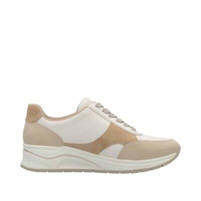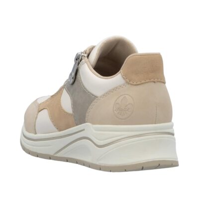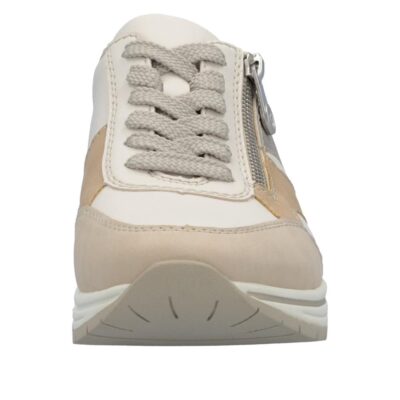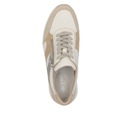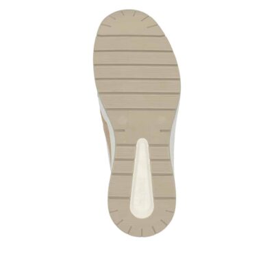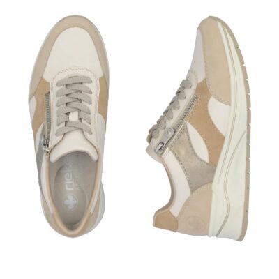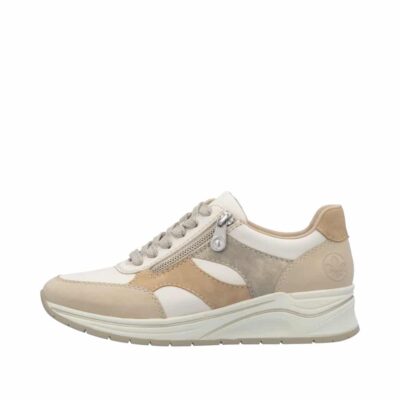Rieker sneakers til dame i beige. Klassiske sneakers i en flot beige farve med flotte detaljer på siden, der skaber et stilfuldt look. Skoen kombinerer snørebånd og en funktionel lynlås, hvilket gør den både nem at tage af og på samt justerbar i pasformen. Den bløde indersål kan fjernes efter behov for øget komfort. Med en kilehæl på 4,5 cm får du et smukt løft, mens den stødabsorberende sål med mønster sørger for stabilitet og god støtte hele dagen..