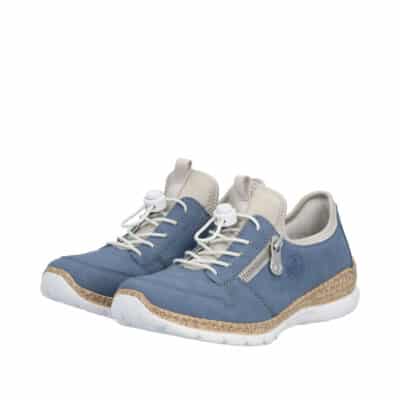 Rieker sneakers til dame i blå. Stilfuld sko i blå, der forener et tidløst design med praktisk komfort. Den elastiske lukning gør skoen hurtig og nem at bruge i en aktiv hverdag. Indvendigt finder du en Memosoft indersål, som tilpasser sig foden og giver en behagelig fornemmelse. Den mønstrede ydersål giver øget støtte og skridsikkerhed hele dagen.