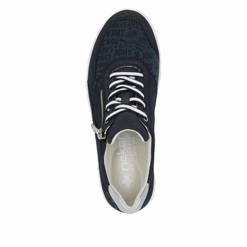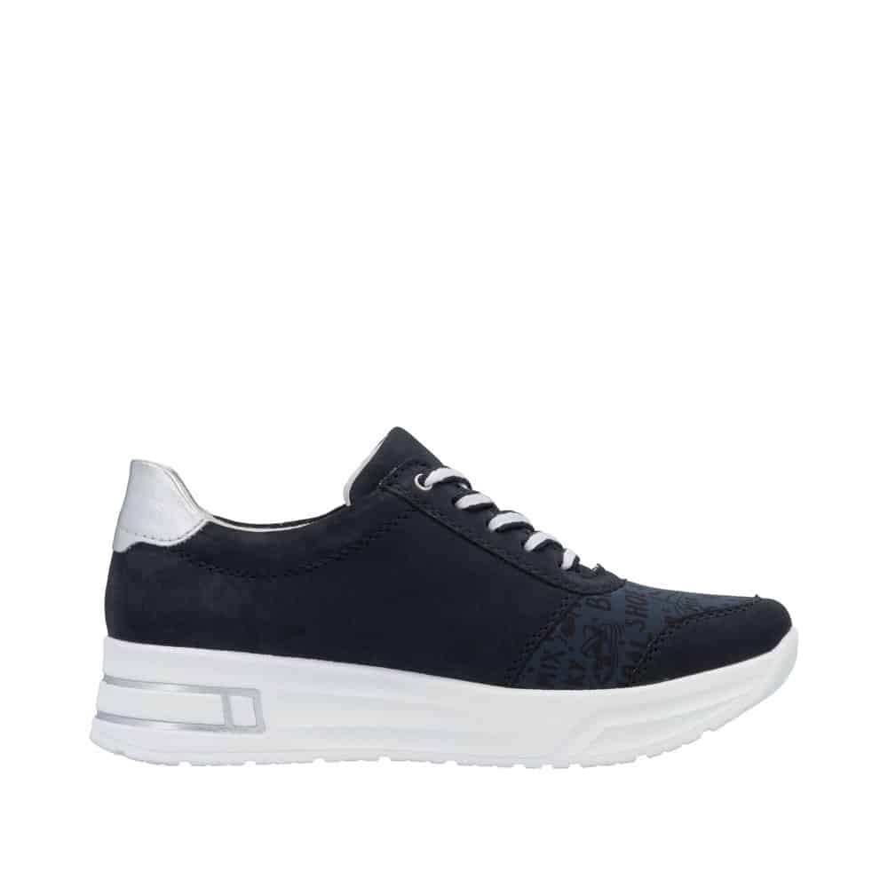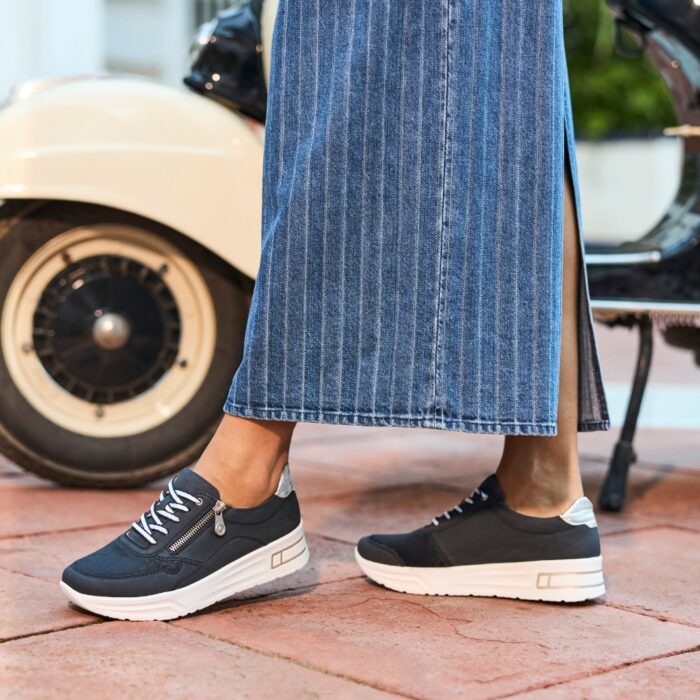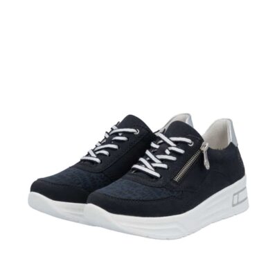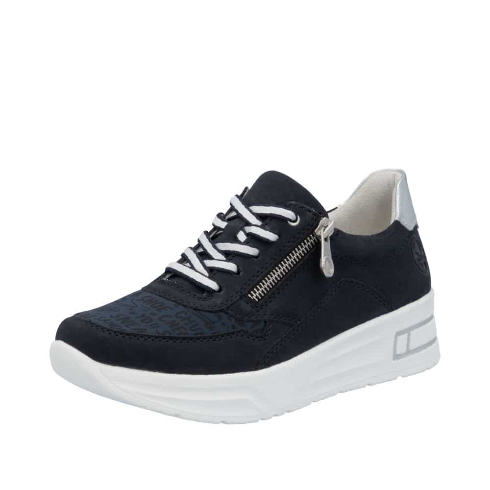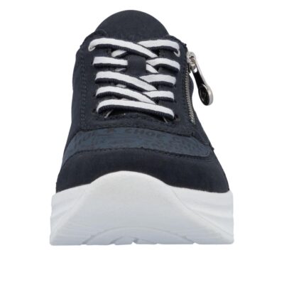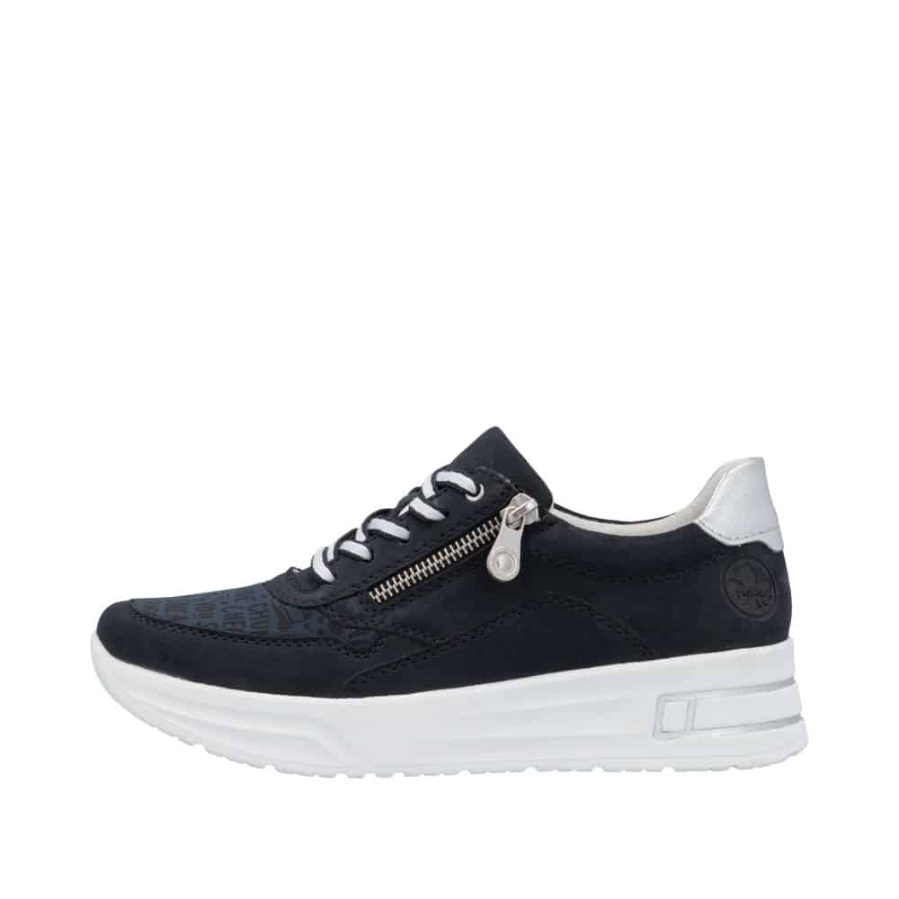 Rieker sneakers til dame i mørkeblå. Disse sneakers fra Rieker kombinerer flot design med praktisk funktionalitet. Lynlåsen på ydersiden gør det nemt at tage skoen af og på, mens snørebåndene foran giver fleksibilitet til at justere pasformen, så den passer præcist til dig. Den bløde, udtagelige indersål sørger for komfort og støtte, og den solide, stødabsorberende ydersål sikrer stabilitet og behagelighed hele dagen.