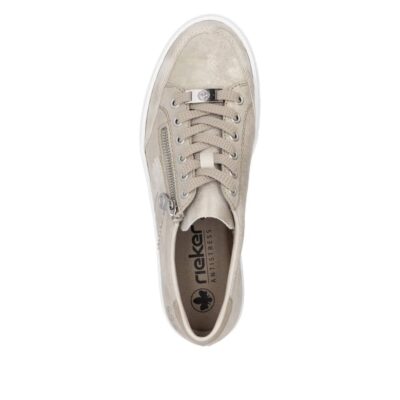 Rieker sneakers til dame i guld. Disse stilfulde sneakers kombinerer komfort og elegance med fine glimmerdetaljer i guld, der tilføjer et luksuriøst præg. Overdelen er lavet af højkvalitets læder, og skoene har en praktisk lynlås på siden samt justerbare snørebånd for en tilpasset og sikker pasform. De bløde indlægssåler giver en behagelig oplevelse hele dagen, mens de stødabsorberende gummisåler sikrer støtte og reducerer belastning på fødderne. Perfekte sneakers til dig, der ønsker en kombination af stil og komfort i hverdagen.