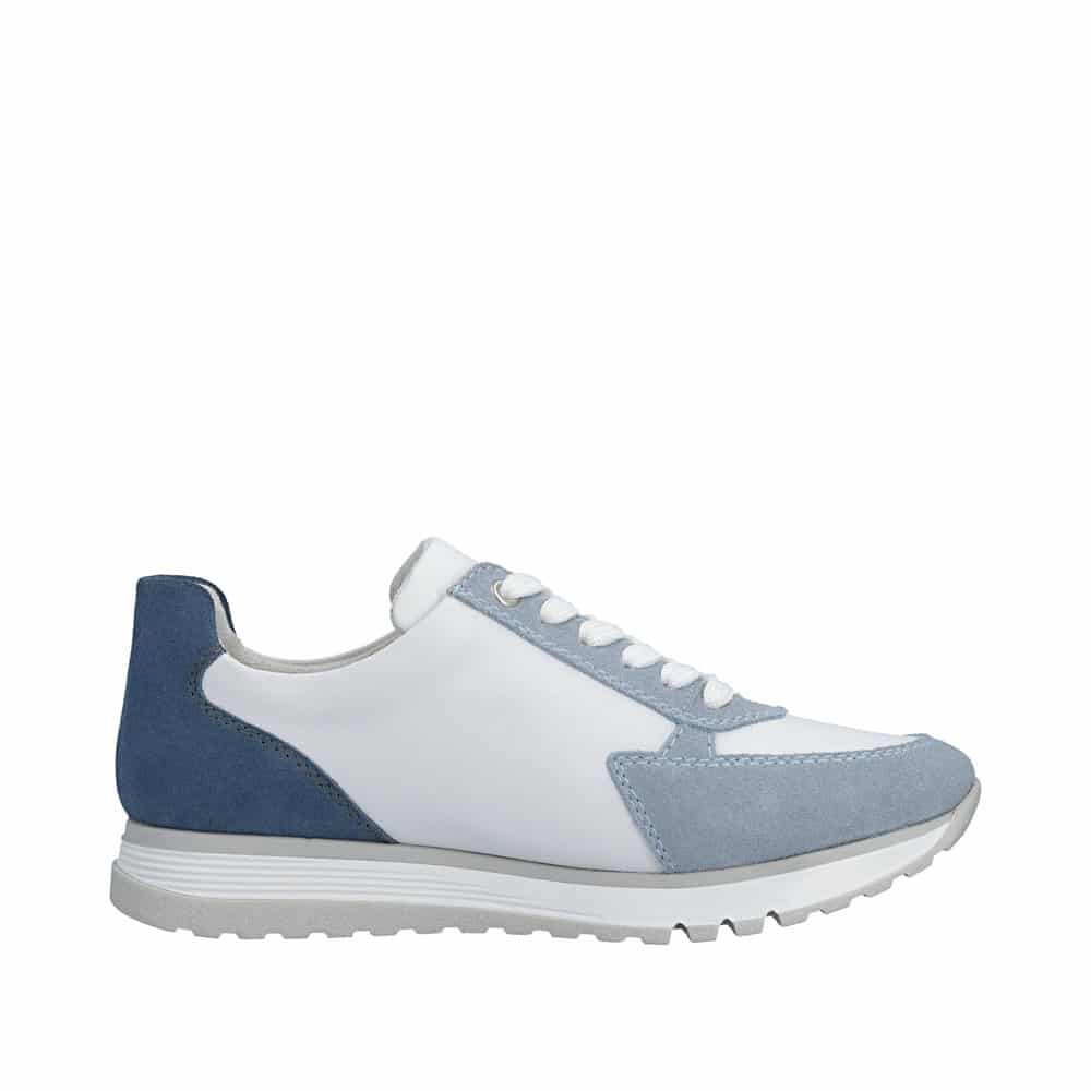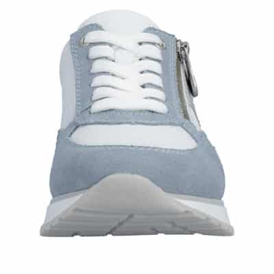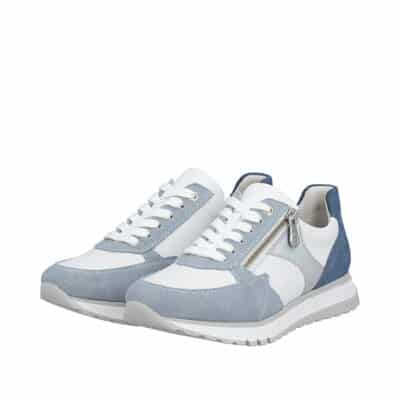 Rieker sneakers til dame i hvid kombi. Denne moderne sko har et flot udtryk med blå detaljer samt en skindoverdel. Skoen er nem at bruge takket være snørebånd og en lille funktionel lynlås. Indvendigt får du en blød og udtagelig indersål samt ekstra bredde H, som sikrer god komfort og fleksibilitet. Ydersålen er designet med et mønster, der giver øget stødabsorbering og skridsikkerhed i dagligdagen.