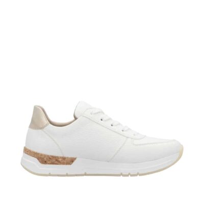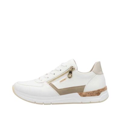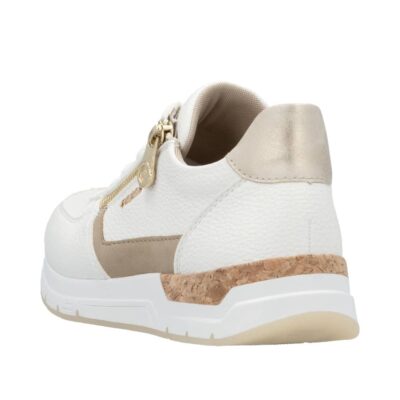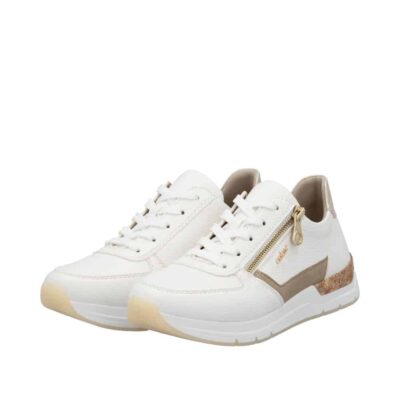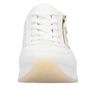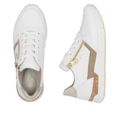 Rieker sneakers til dame i hvid. Denne sneakers forener elegance og komfort på bedste vis. De brune detaljer på siden og den gyldne funktionelle lynlås på ydersiden giver et stilfuldt look, samtidig med at det gør det nemt at tage skoen på og af. Med snørebåndene foran kan du justere pasformen, så den passer perfekt. Indvendigt finder du en blød og udtagelig indersål, som giver dig optimal komfort. Ydersålen har stødabsorberende egenskaber og et skridsikkert mønster, der sikrer støtte hele dagen.