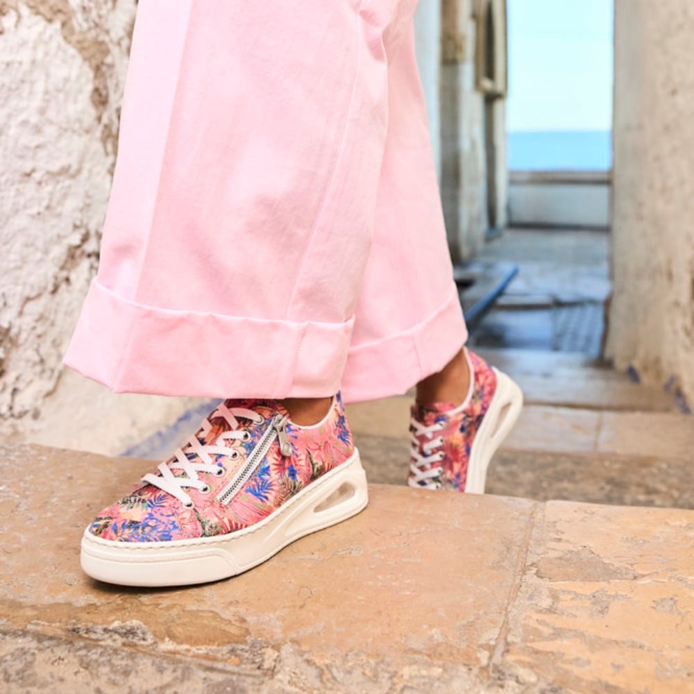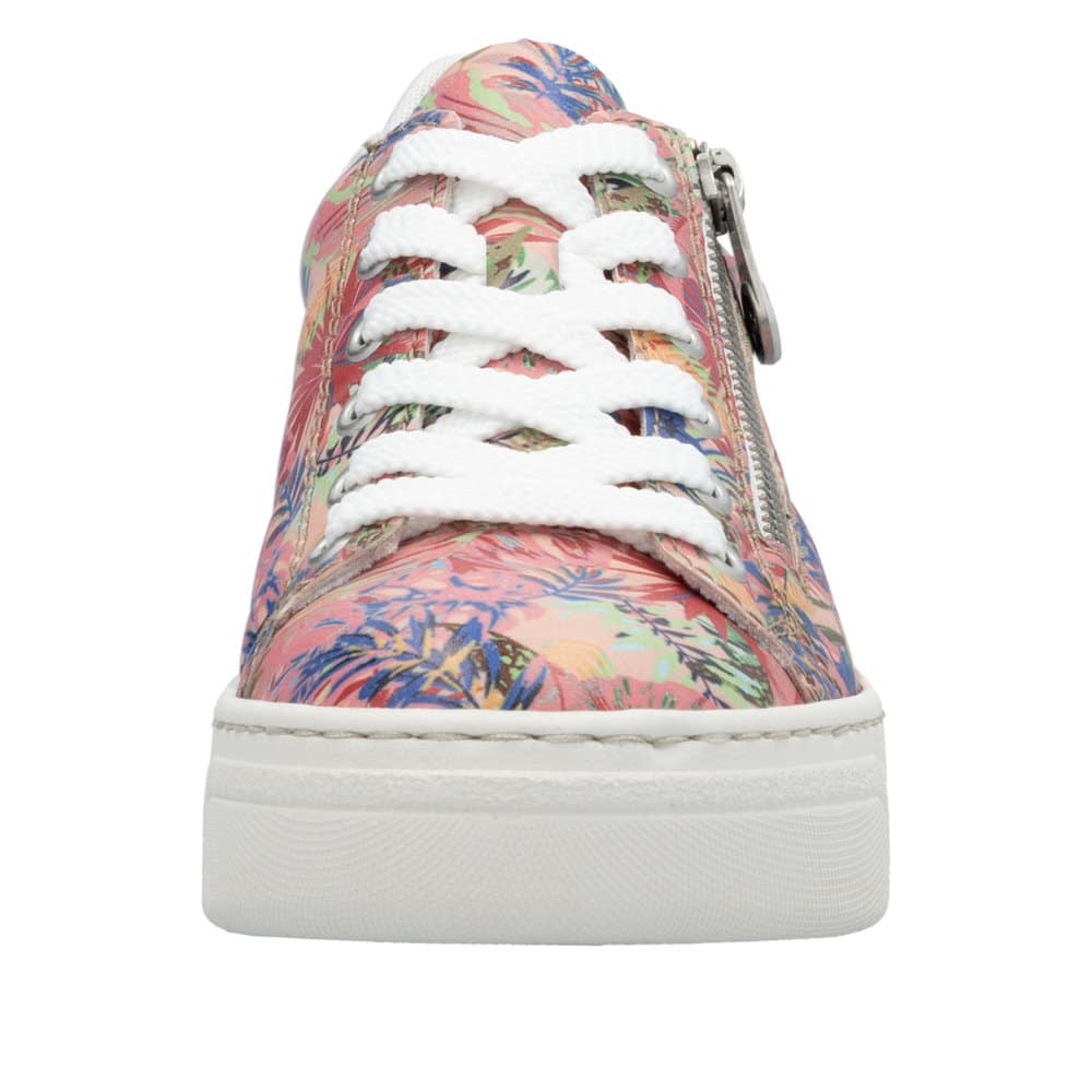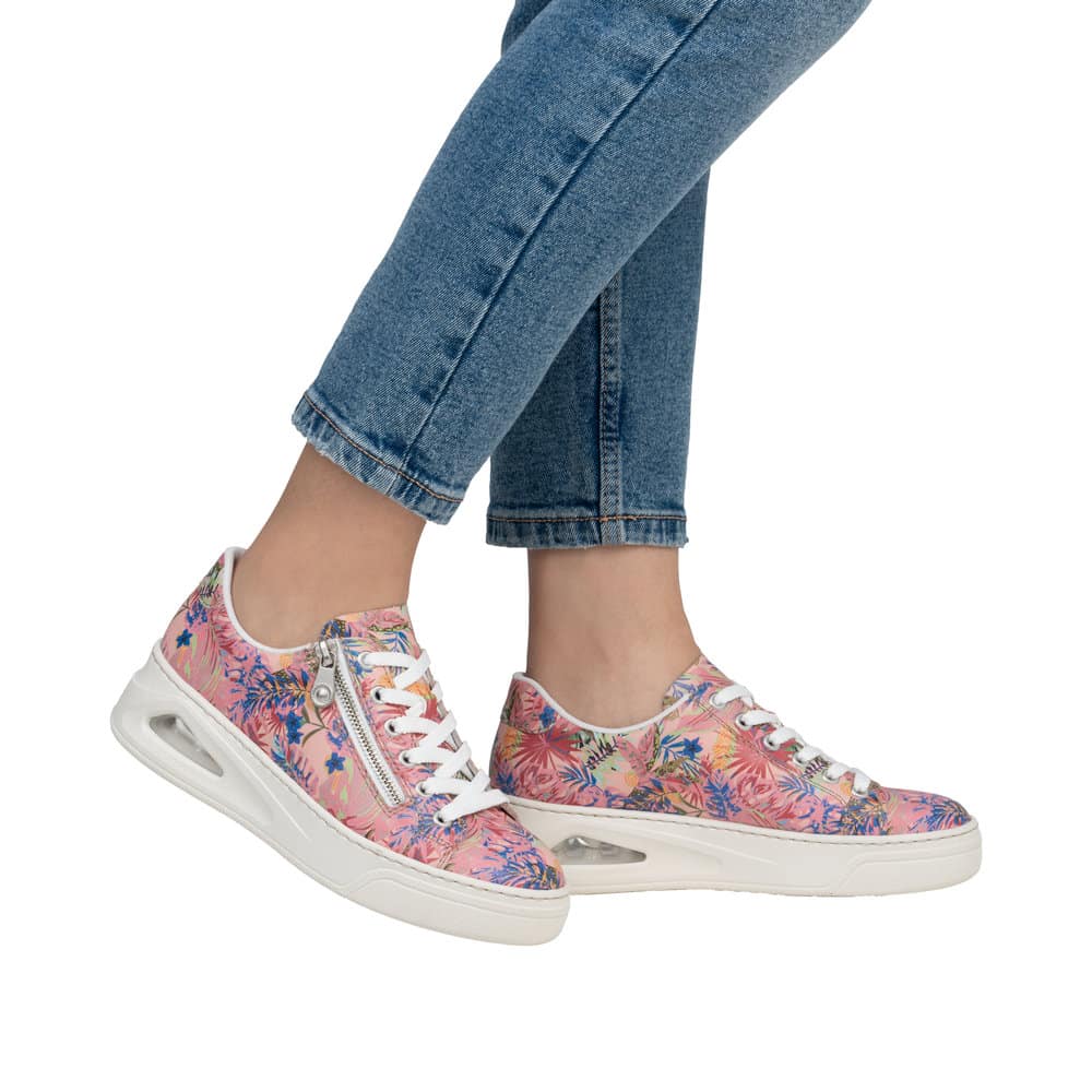 Rieker sneakers til dame i en flot farvekombination. Disse sneakers kombinerer mode og funktion med deres unikke farvesammensætning og gennemsigtige Rieker Air Bubble i plateausålen. En lynlås på ydersiden gør det hurtigt og nemt at tage skoen på, mens snørebåndene sikrer en perfekt pasform. Indvendigt giver den bløde skindindersål maksimal komfort. Med en ydersål på ca. 4,5 cm og stødabsorberende egenskaber får du både stil og støtte til hele dagen.