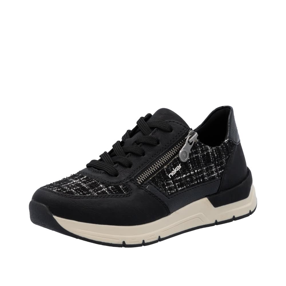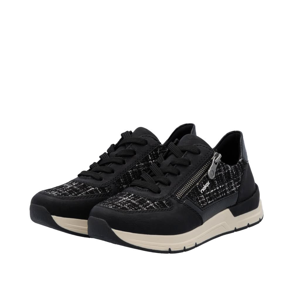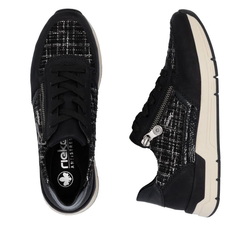 Rieker sneakers til dame i sort. Flotte sorte sneakers med moderne detaljer, som gør dem oplagte til både hverdag og fritid. Skoene har snørebånd samt en lynlås i siden, der giver mulighed for en justerbar og nem pasform. Indersålen er blød og kan tages ud efter behov. Den fleksible ydersål med Rieker Antistress-teknologi sørger for stødabsorbering og let komfort gennem hele dagen.