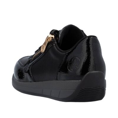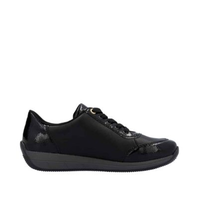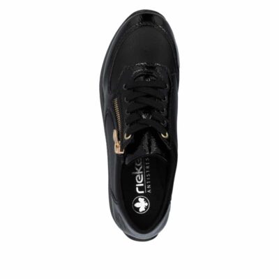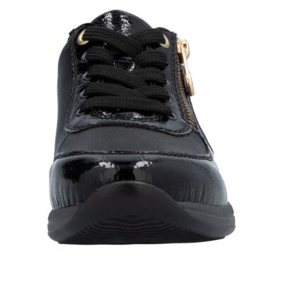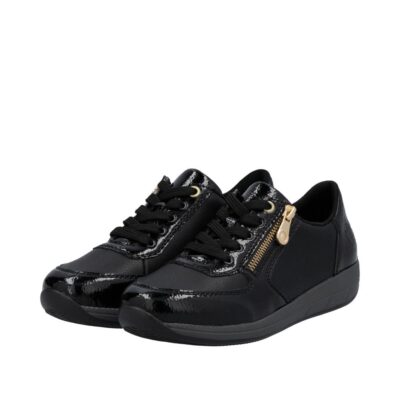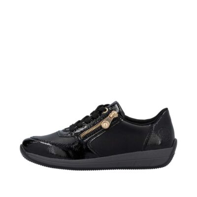 Rieker sneakers til dame i sort. Moderne sneakers med en kombination af skind og lakdetaljer, der giver et sofistikeret og stilfuldt design. Skoen har en praktisk gylden lynlås på ydersiden og justerbare snørebånd, som gør det nemt at få den på og af. Den indvendige bløde, udtagelige indersål og de stødabsorberende såler sikrer maksimal komfort. Den ekstra brede pasform (H) gør skoen rummelig og komfortabel til bredere fødder.