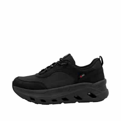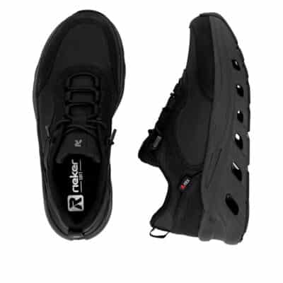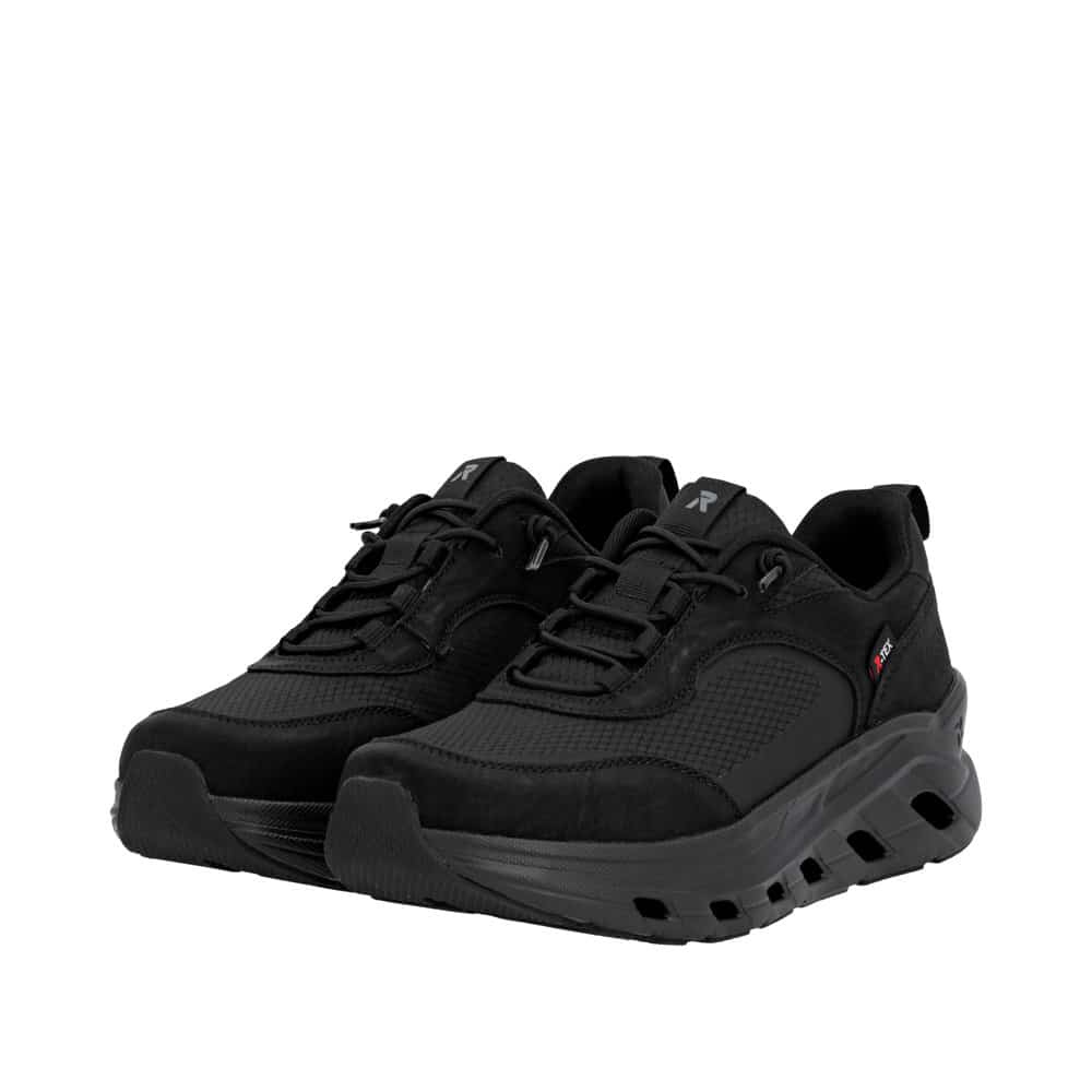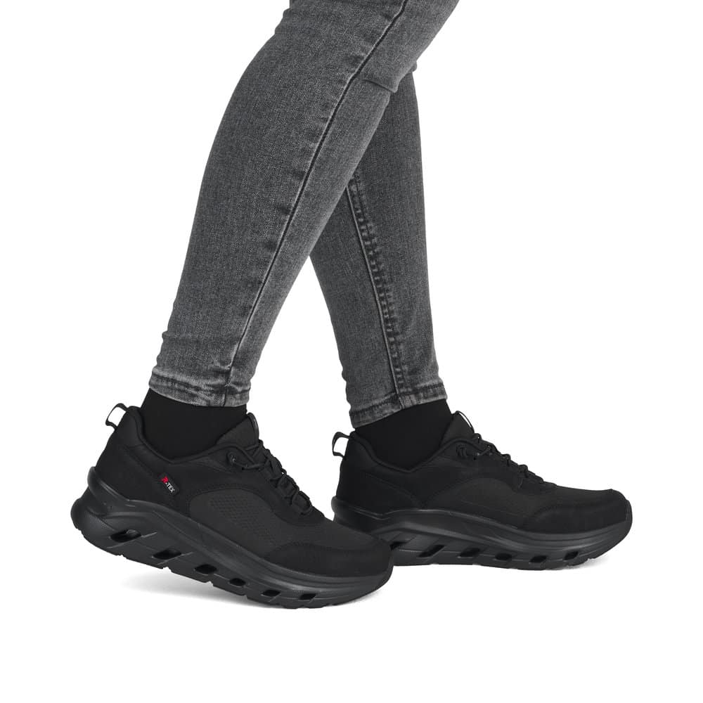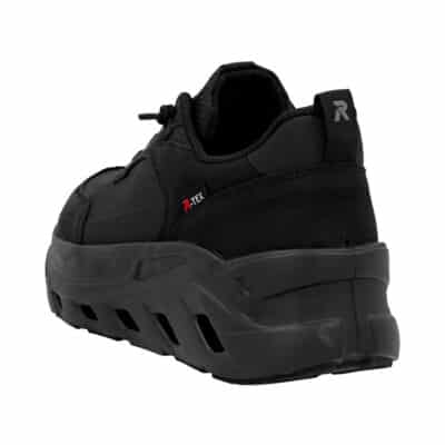 Rieker sneakers til dame i sort. Disse sneakers er både smarte og praktiske med deres klassiske sorte farve og sporty udtryk. En elastik foran gør dem lette at tage på og af, mens den bløde udtagelige indersål sørger for komfort gennem hele dagen, mens ekstra bredde (G) giver mere plads til foden, mens Rieker-Tex gør skoen kraftig vandafvisende og den mønstrede ydersål giver øget stødabsorbering og skridsikkerhed.