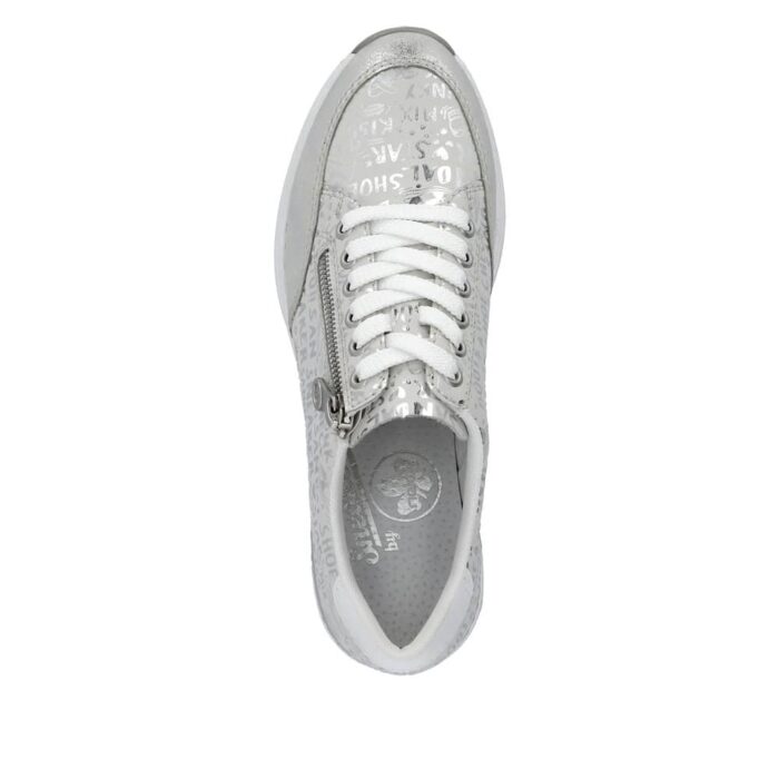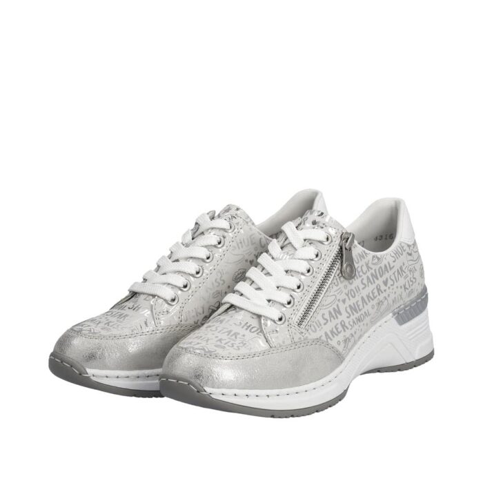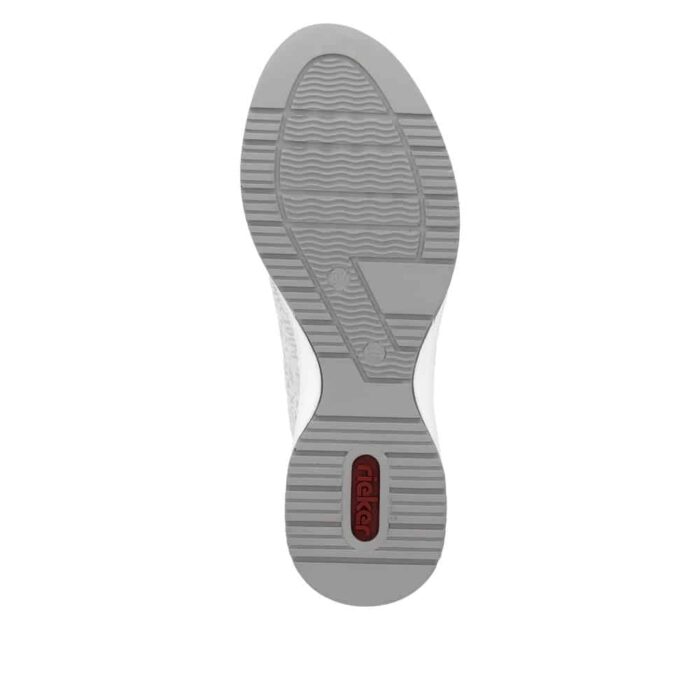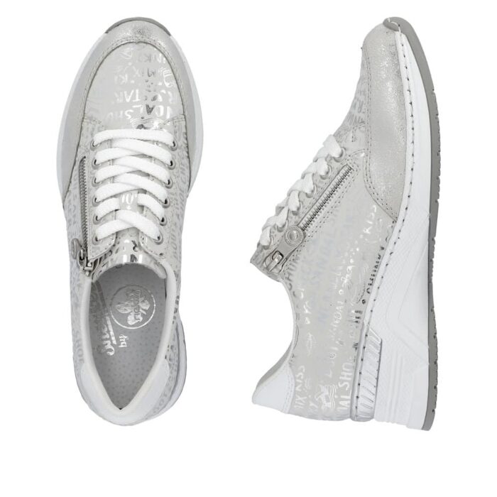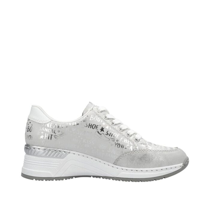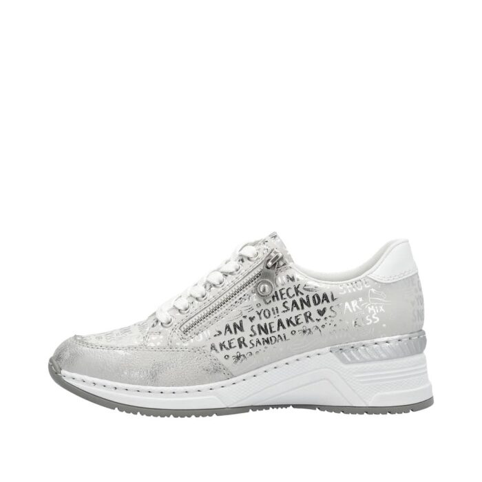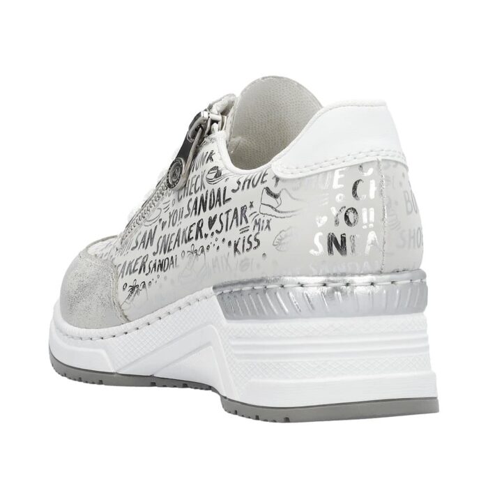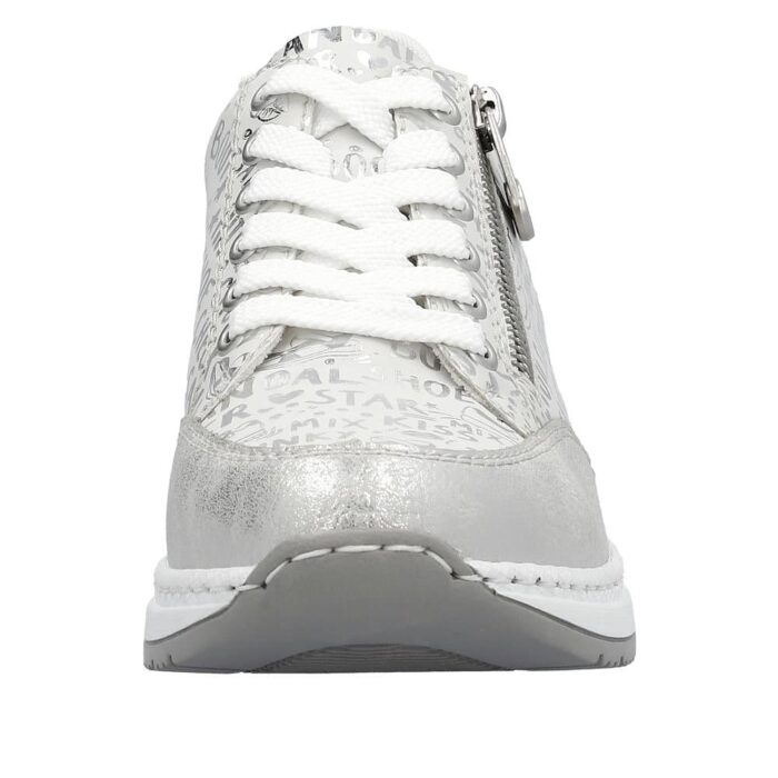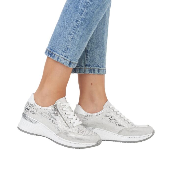 Rieker sneakers til dame i hvid. Disse sneakers er prydet med imponerende sølvdetaljer, der strækker sig over hele skoens overflade. Skoene er designet med både snørebånd og lynlås, og de er udstyret med en Antistress sål. Denne sål kombinerer stødabsorbering og fleksibilitet for at sikre optimal komfort til dine fødder. Derudover har denne sneakers en diskret kilehæl, der tilføjer en ekstra elegance til designet.