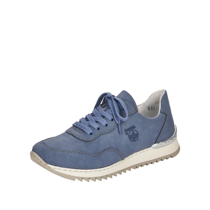 M3611-14 Rieker Sneakers i Blå til Dame. Dejlig let og super fed, sneakers i skind kvalitet. Modellen har et fedt tidsløst design, som kan bruges til enhver lejlighed. Modellen har en lækker blød sål, som let kan udskiftes ved behov.